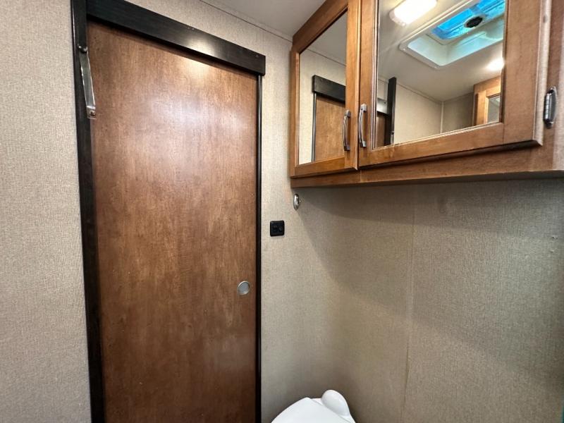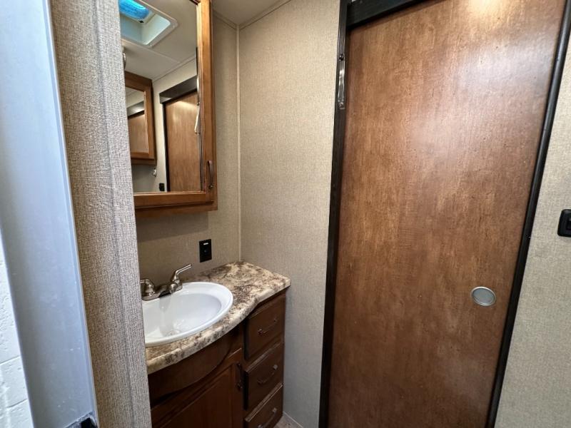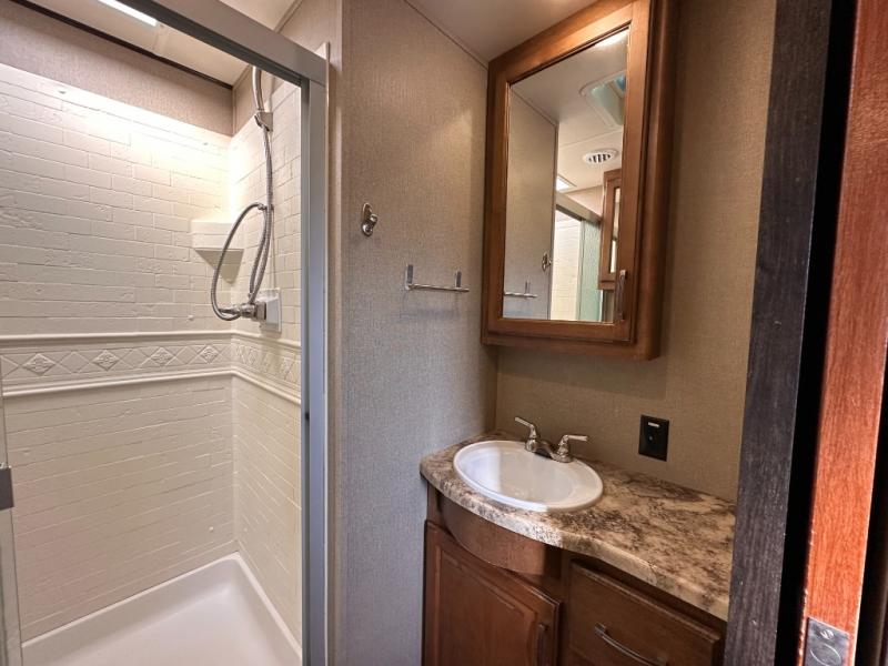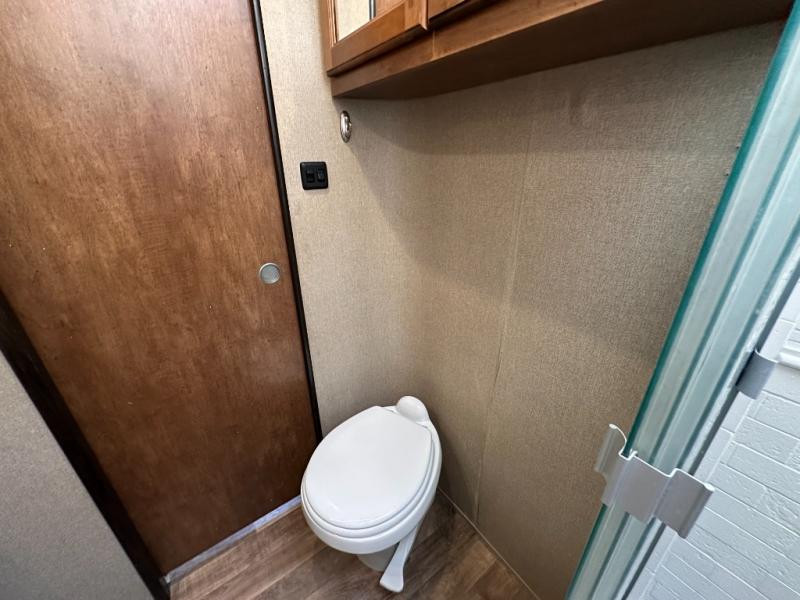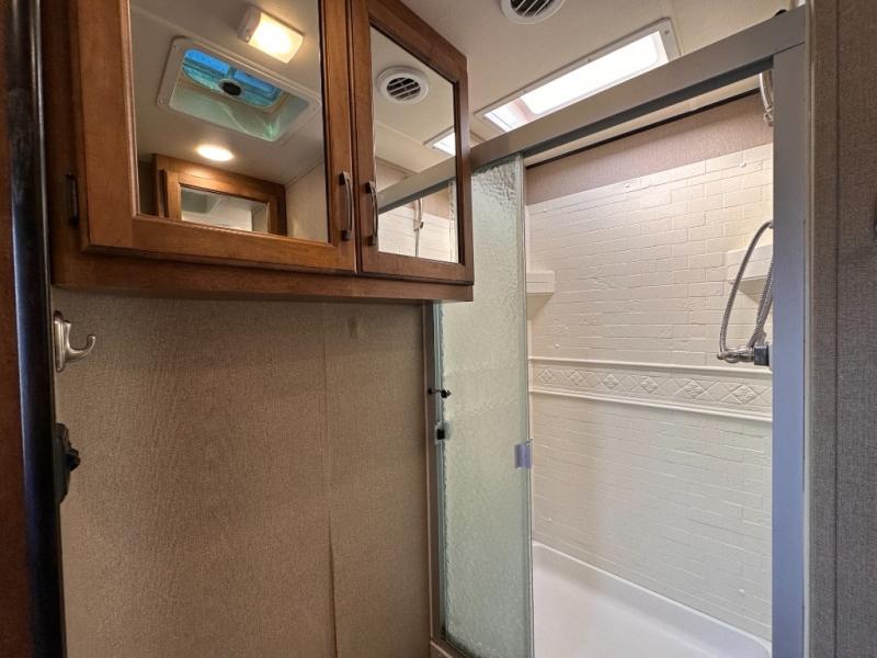 Head inside and find opposite the door a complete bath including a toilet, a vanity with sink, plus a 30" x 36" shower with skylight. There is also a bit of storage above the toilet and sink.