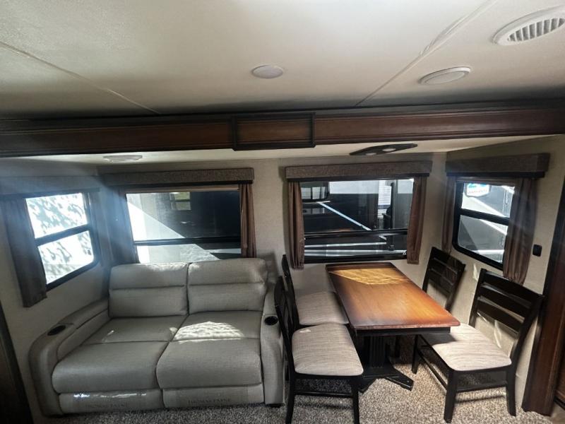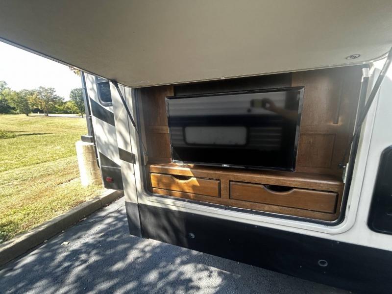 The rear portion of the curb side slide out features a 40" TV, and an entertainment center with fireplace below. Adjacent enjoy a tri-fold sofa, end tables and overhead cabinets that stretch the entire width of the unit. This can easily be made into sleeping space at night, and there is more seating in the theatre seats next to the dinette slide out which is opposite the entertainment center, plus so much more!