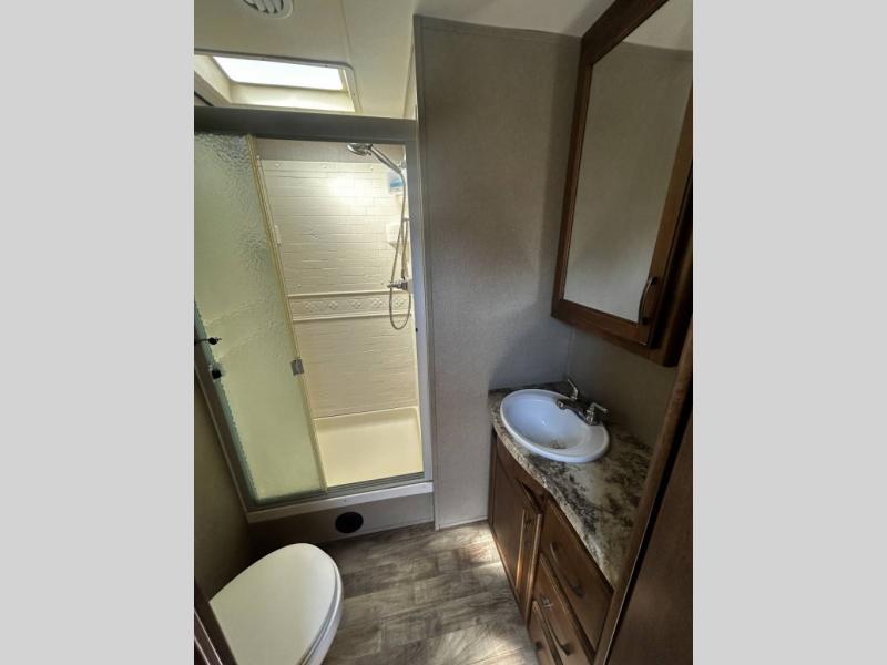 Head inside and find opposite the door a complete bath including a toilet, a vanity with sink, plus a 30" x 36" shower with skylight. There is also a bit of storage above the toilet and sink.