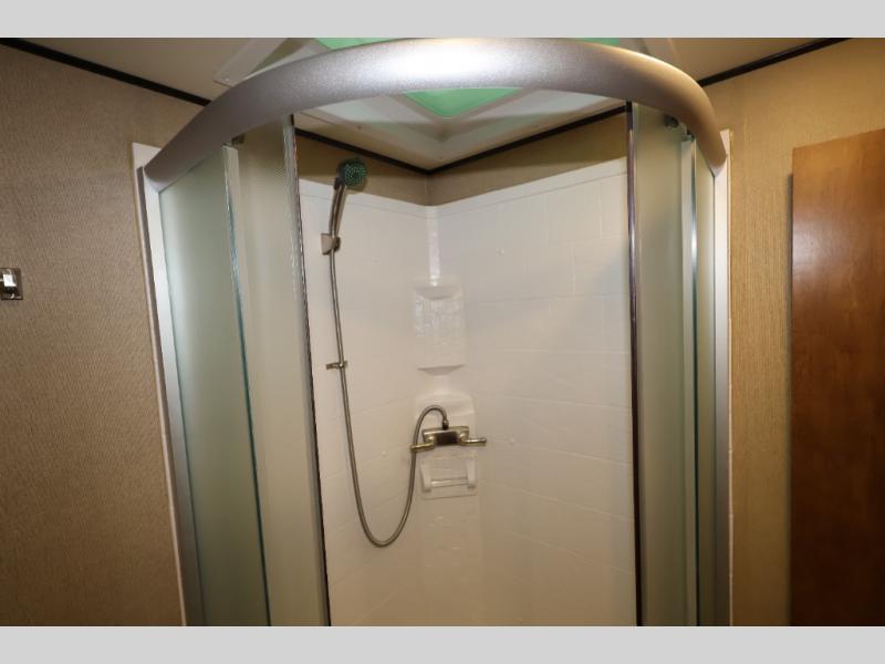 As you enter you can head right and step up to a side aisle bath and master suite. The bath offers a radius shower with skylight, toilet, corner vanity with sink, and linen cabinet within the bedroom slide. There is also a second sliding door allowing you access to the bedroom.