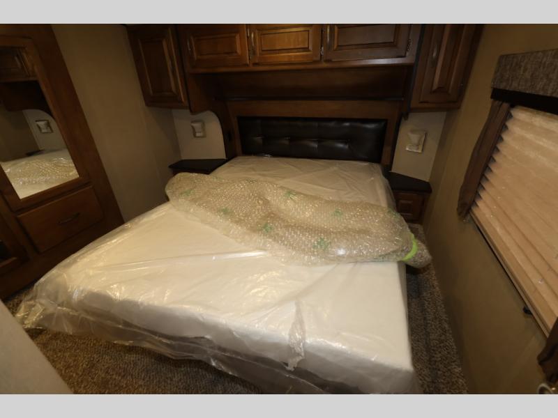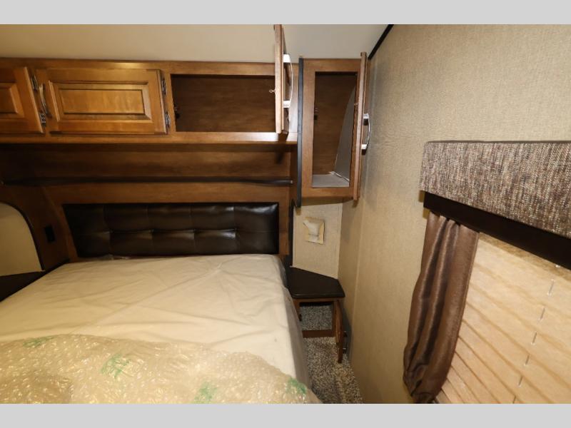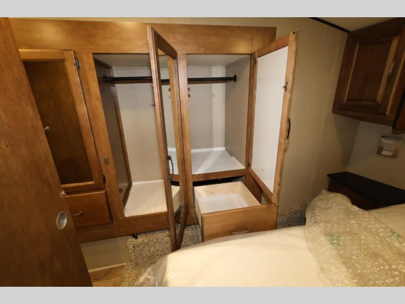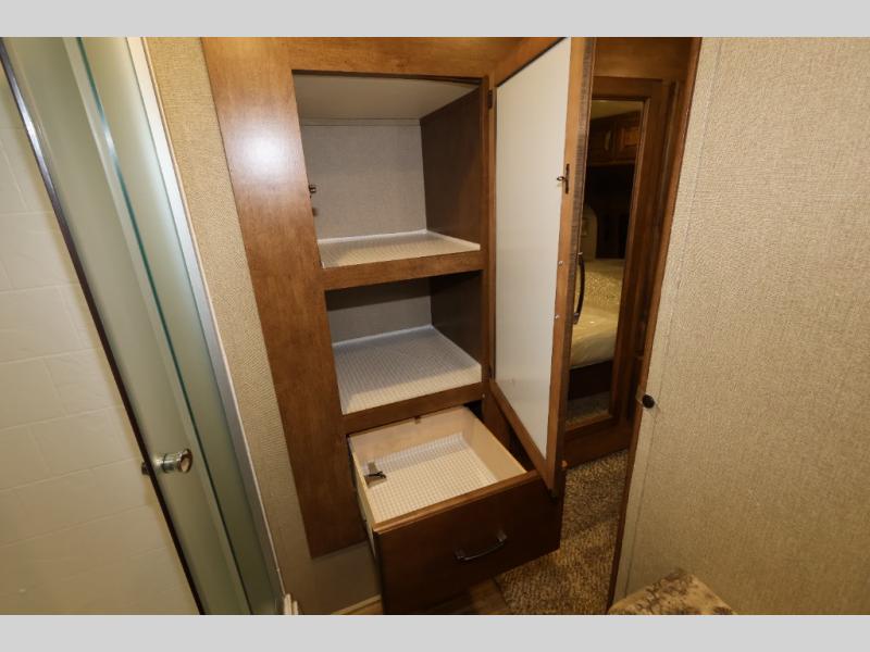 In the bedroom find a queen size bed, storage on either side of the bed, plus above the head of the bed as well. There is a slide out with two wardrobes for your clothing, plus the linen cabinet mentioned above that is accessible from within the bathroom.