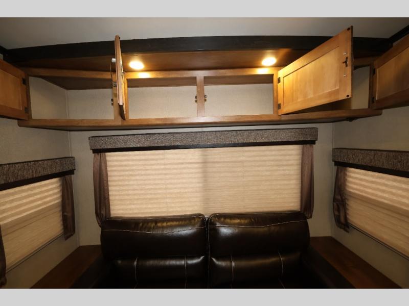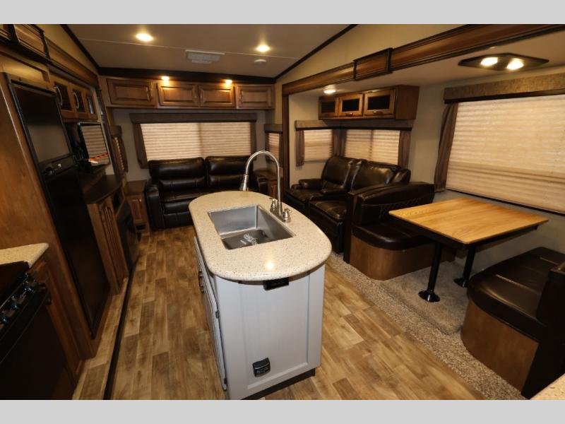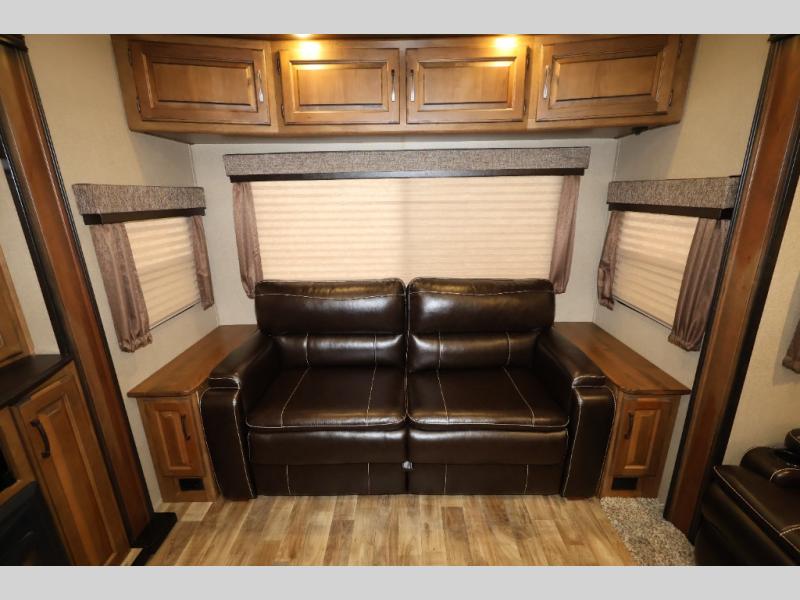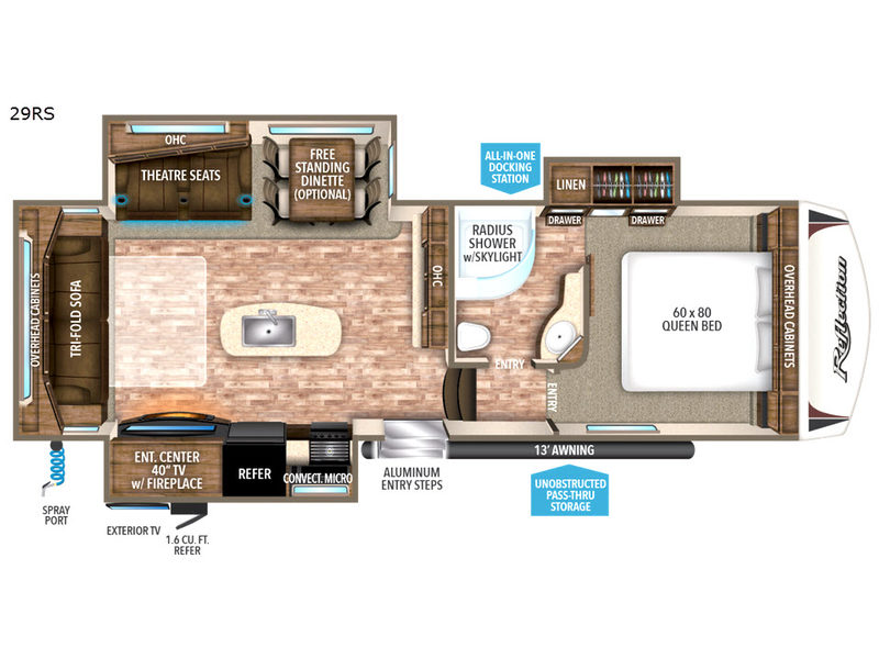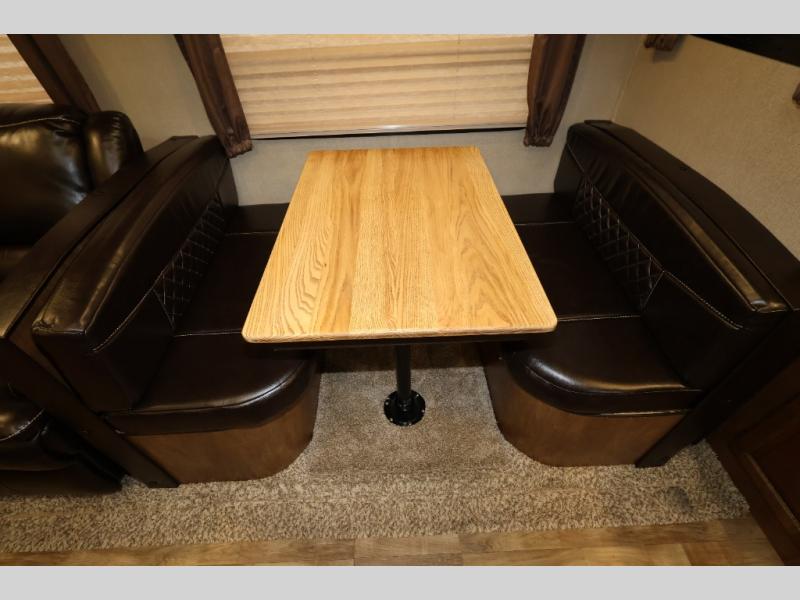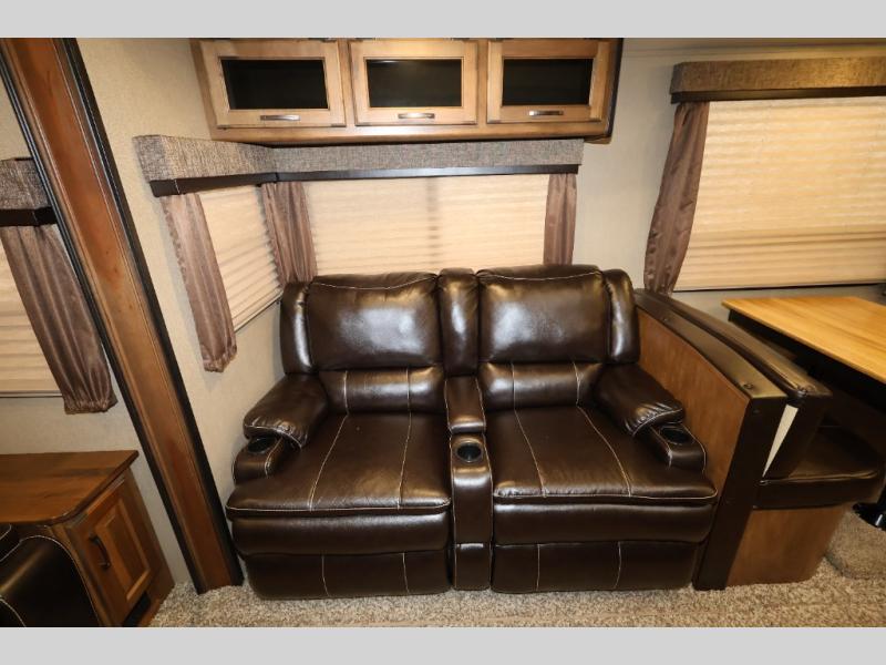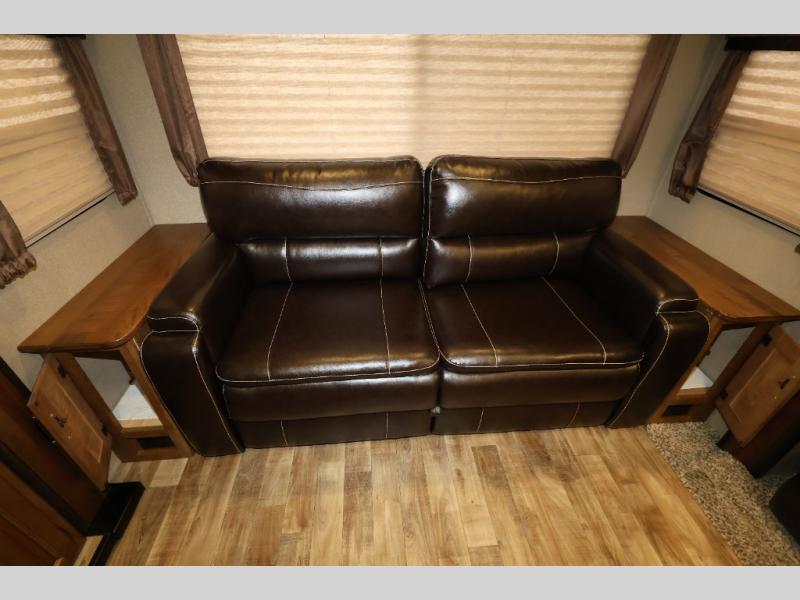 Across the rear wall of this Reflection unit you will enjoy a tri-fold sofa with storage cabinets above and end tables to store more camping items. Adjacent, in the second living area slide out you will find theatre seating for two and an optional free standing dinette (pictured) instead of a booth dinette.