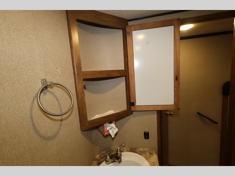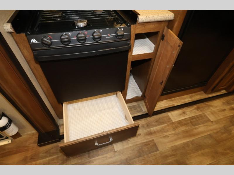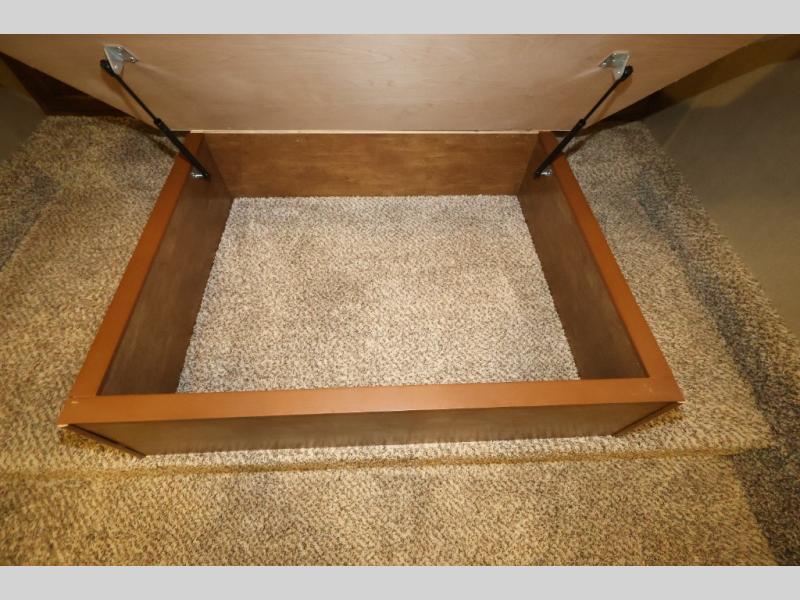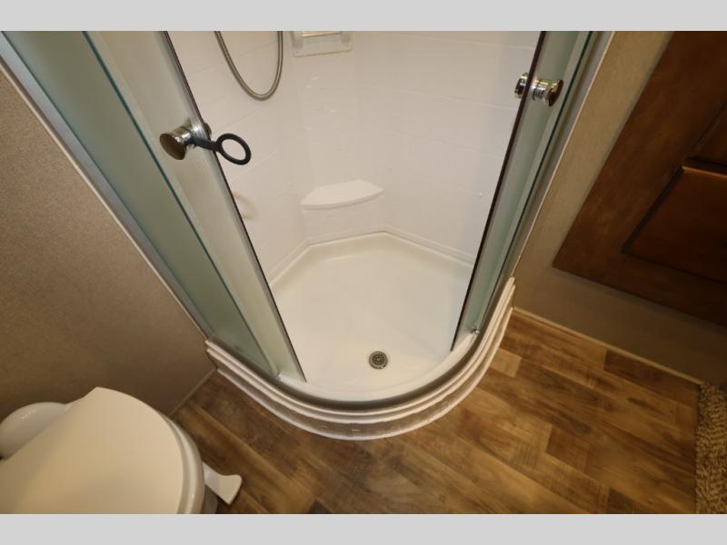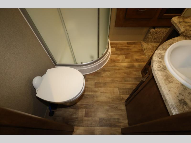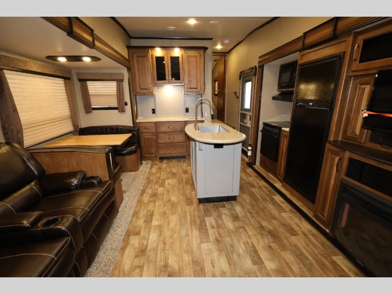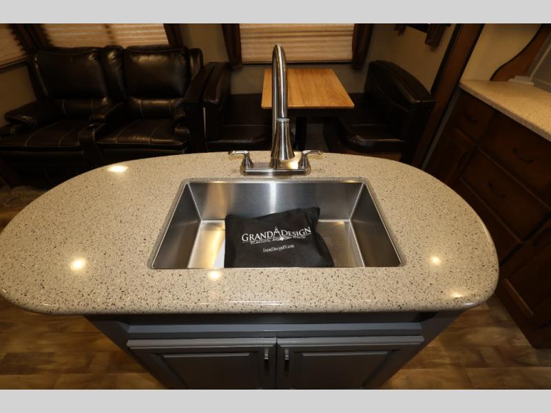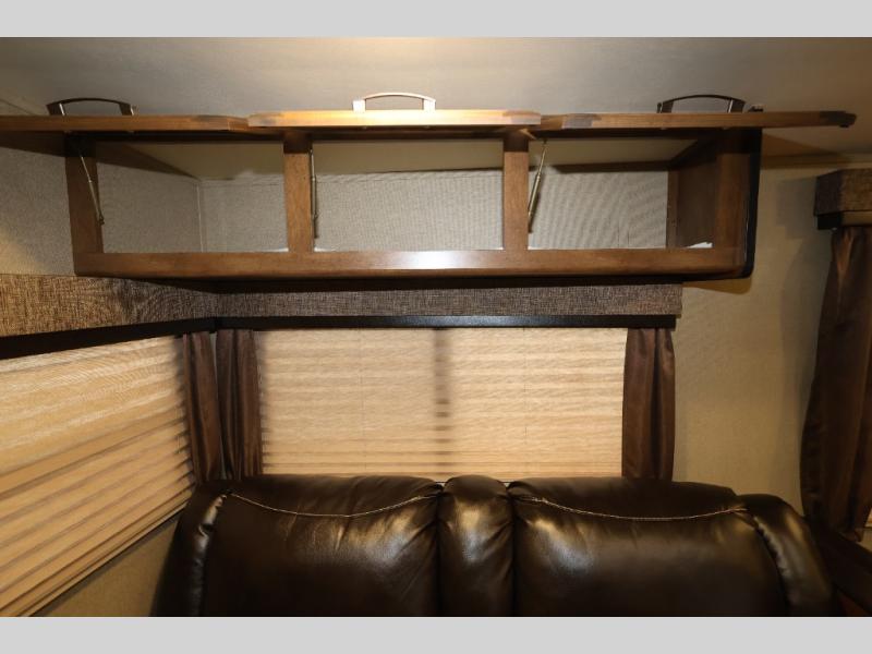 Across the rear wall of this Reflection unit you will enjoy a tri-fold sofa with storage cabinets above and end tables to store more camping items. Adjacent, in the second living area slide out you will find theatre seating for two and an optional free standing dinette (pictured) instead of a booth dinette.
