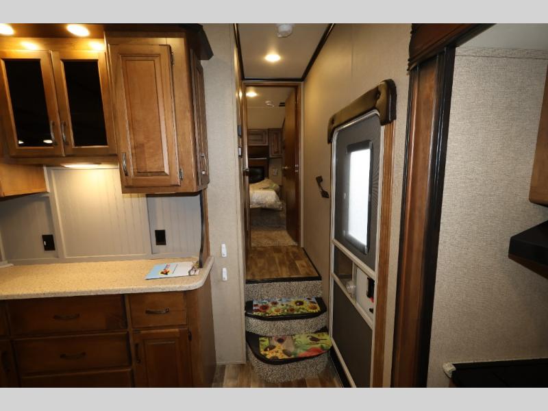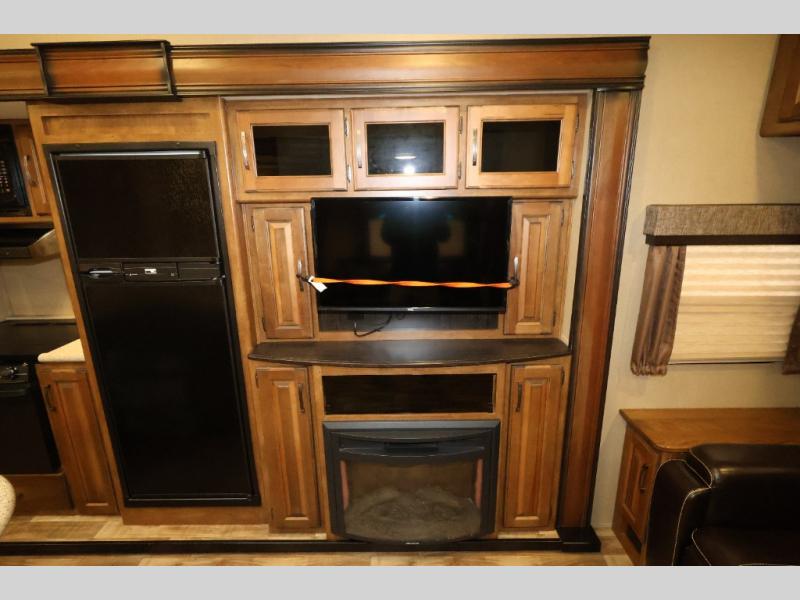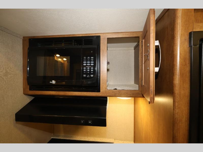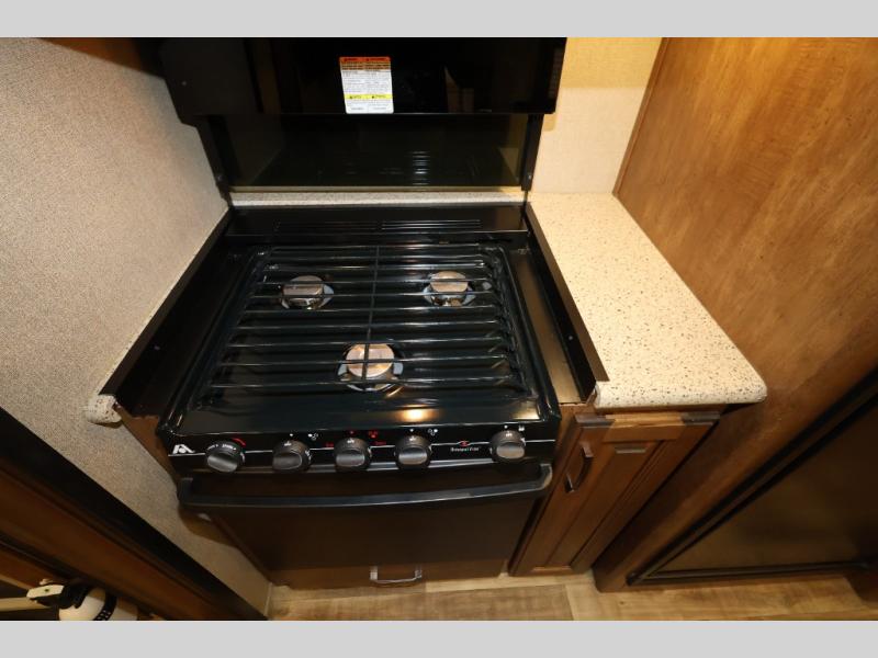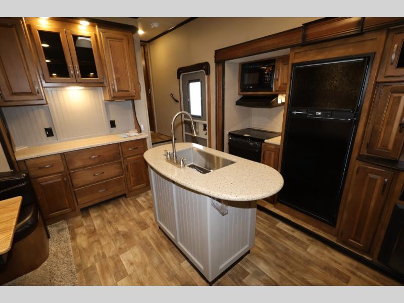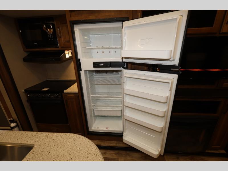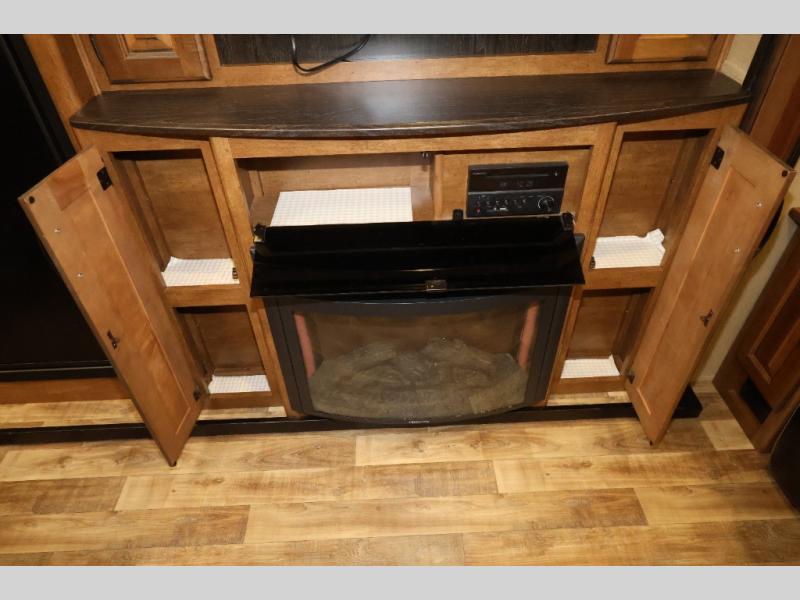 Back down on the main level find a kitchen area with countertop and overhead storage space along the interior living area wall. There is a convenient kitchen island with a large sink and counter prep space. The first slide out is along the entrance door wall including a three burner range with convection microwave above, a refrigerator, and an entertainment center with a 40" TV plus a fireplace.