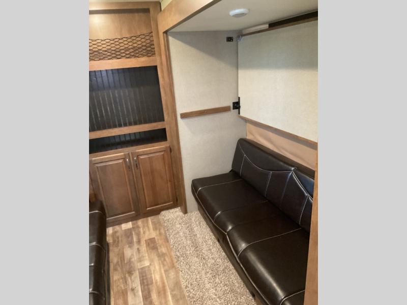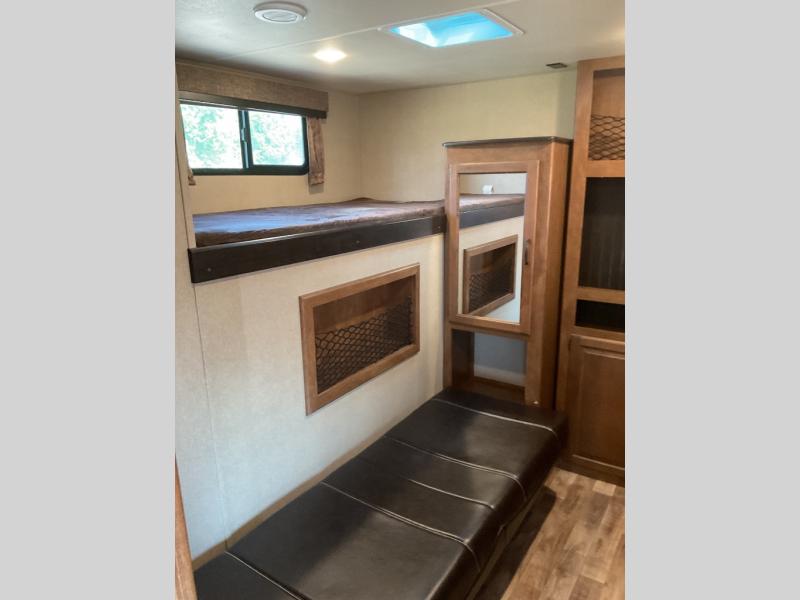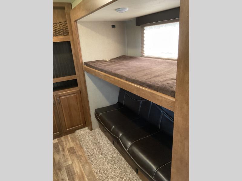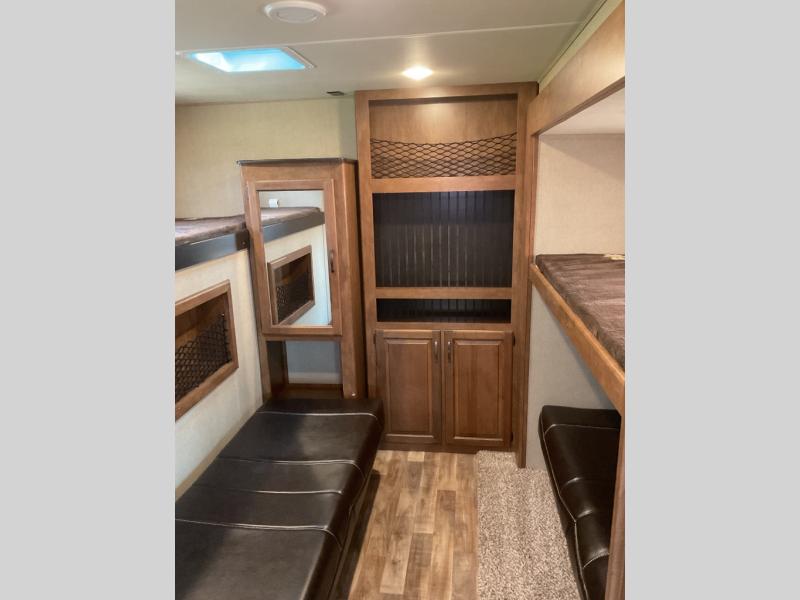 In the rear of this Reflection unit find a private bunkhouse with a slide out tri-fold sofa with a flip bunk above along the road side. On the opposite side there is a set of bunk beds with drawer storage below. The bunkhouse also features an entertainment center, TV prep, and a wardrobe.