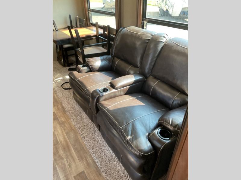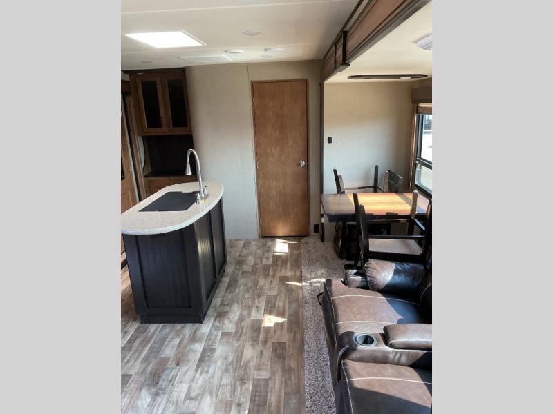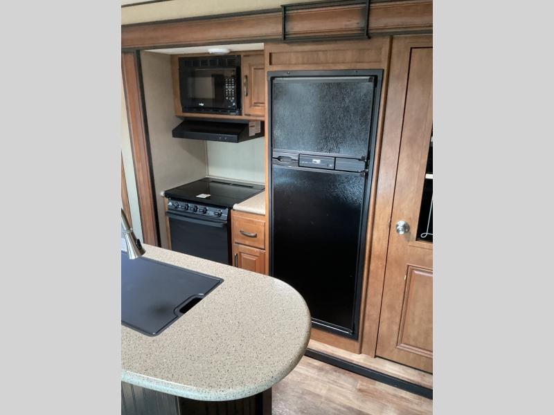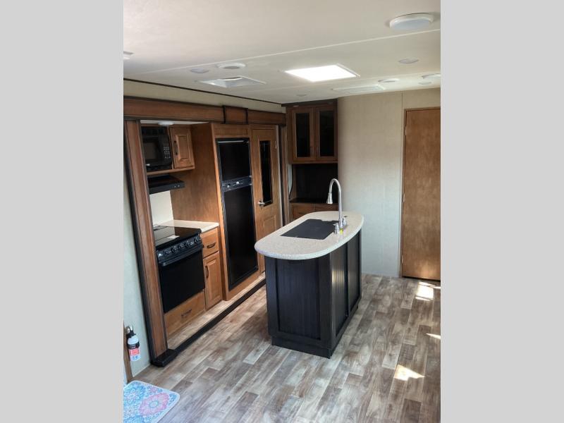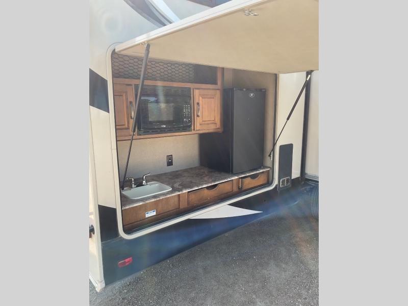 A generous exterior unobstructed pass-through storage compartment in the front makes it easy to store all of your outdoor camping gear. The all-in-one docking station comes in handy too. Along the rear curbside enjoy an outdoor kitchen which features a sink, microwave, overhead storage, a refrigerator, and two burner cooktop, plus more!