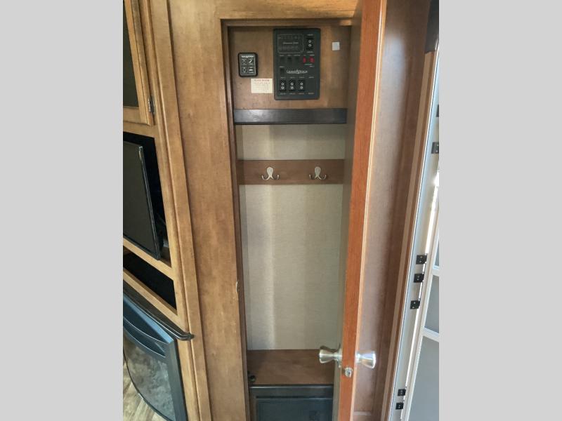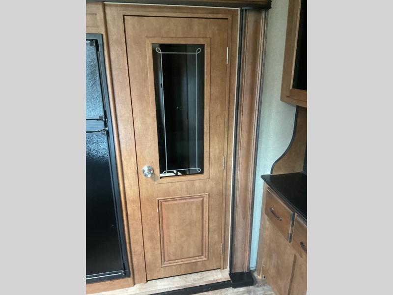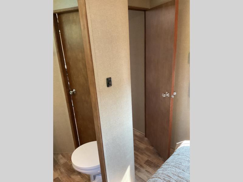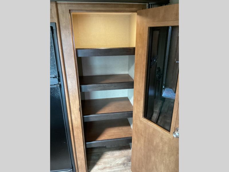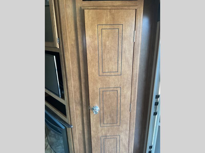 Enter the side door and find yourself in a wide open kitchen and living space with dual opposing slides. Notice the handy coat closet to your immediate right. There is a slide out three burner range, convection microwave, refrigerator, and a pantry to the left of the door. Opposite find a slide out theatre seat or tri-fold sofa option, and booth dinette or free standing dinette option.