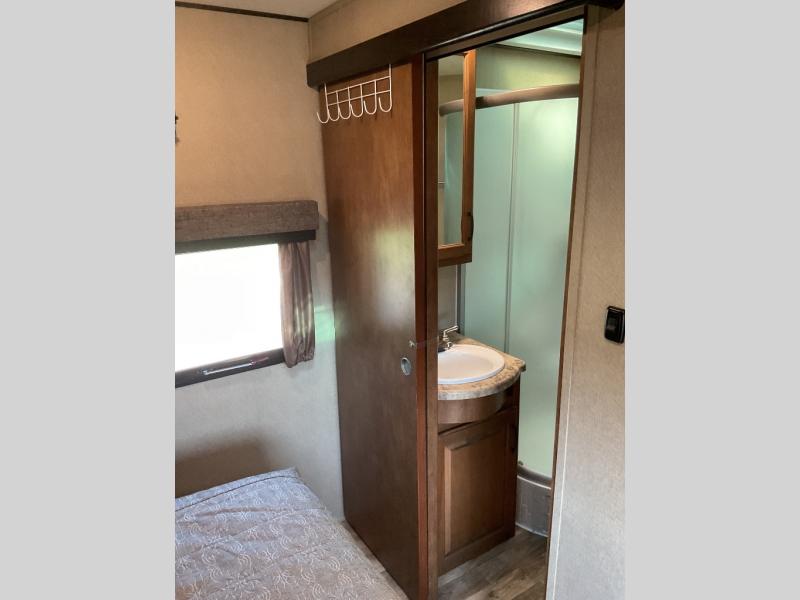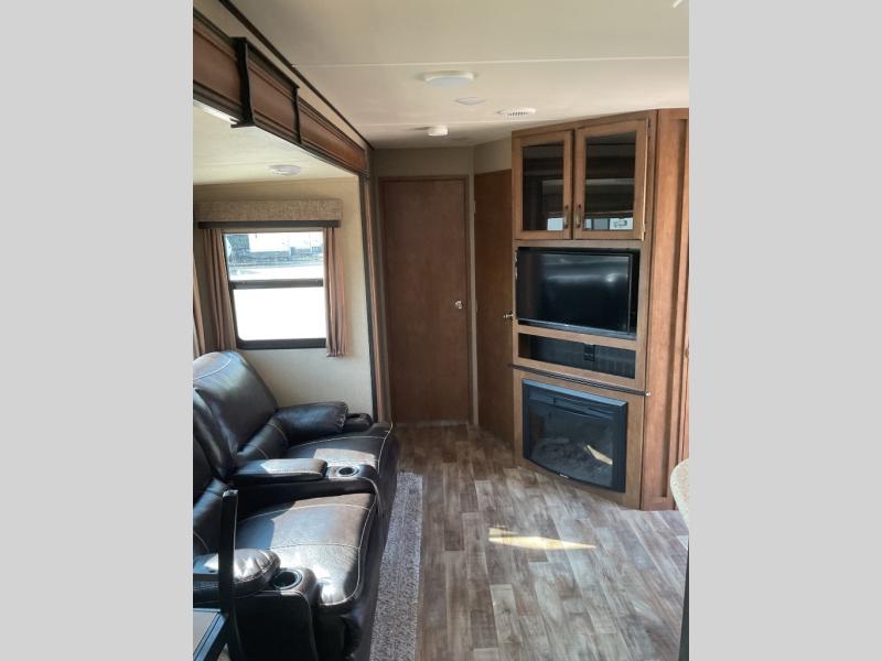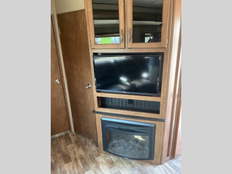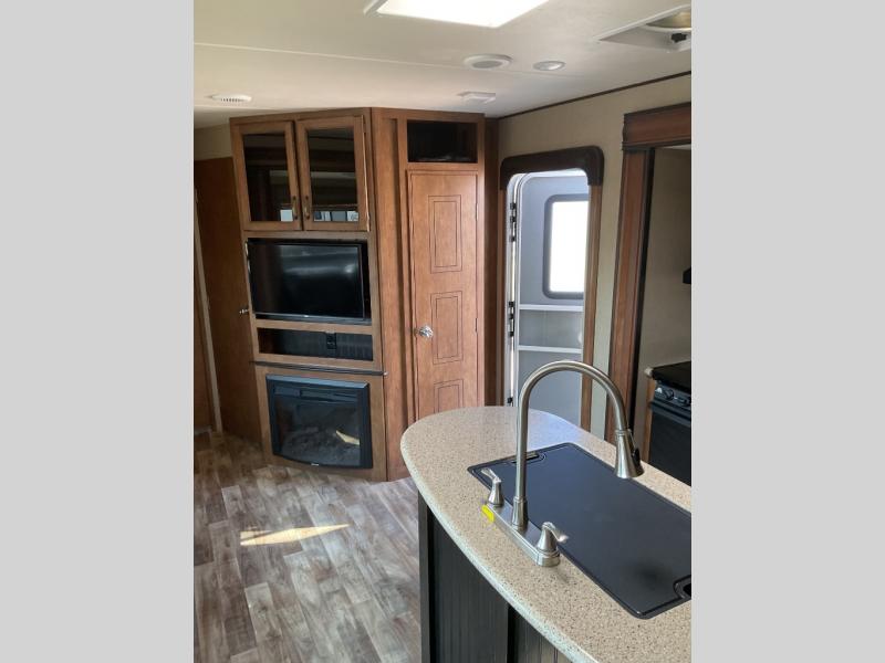Enjoy the entertainment center with fireplace beneath a 32" TV along the exterior angled bathroom wall. There is also a center kitchen island with a large sink, plenty of counter space, and storage. A hutch is next to the kitchen slide providing a space to display your decor and store more dishes.