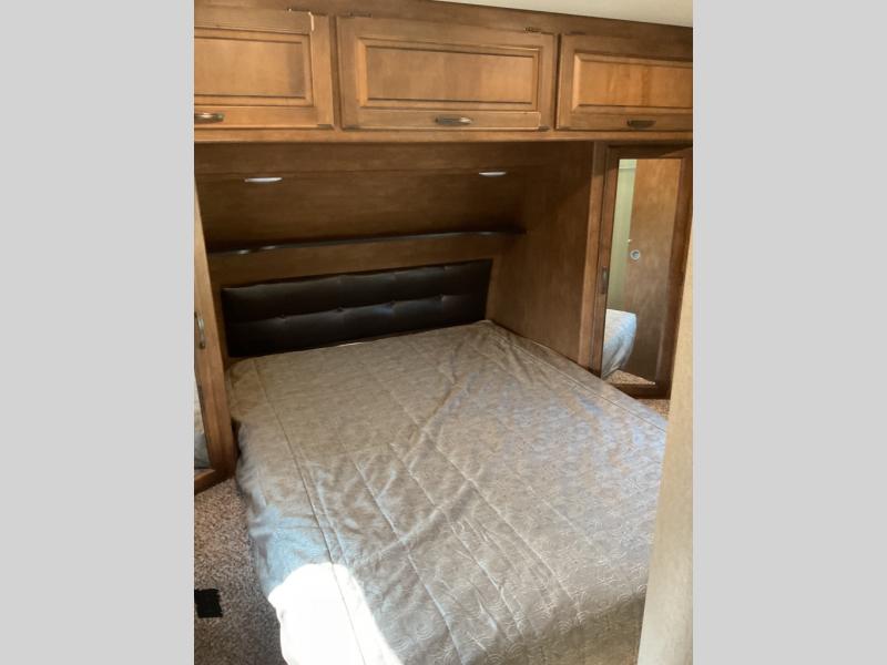 The bedroom can also be accessed from the hall. When you step inside find a queen bed, dual bedside wardrobes, plus overhead cabinets.