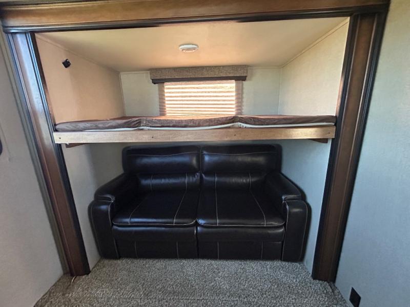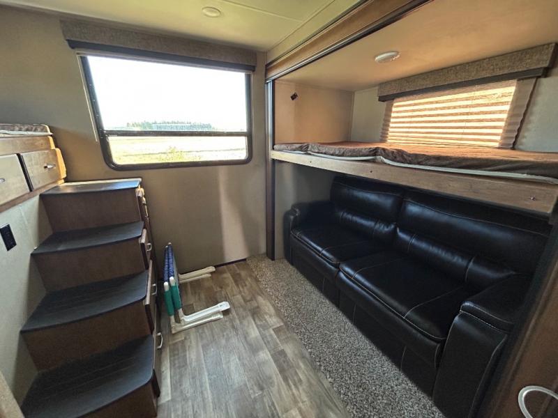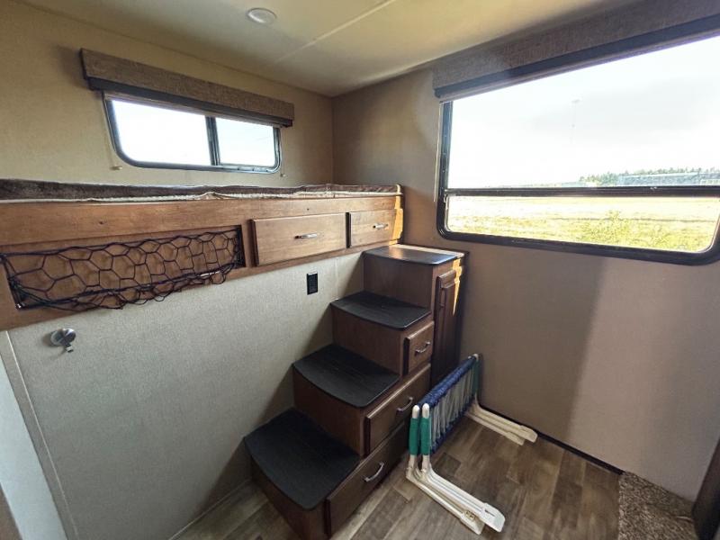 In the rear of this Reflection unit find a private bunkhouse with a slide out tri-fold sofa with flip bunk above on the right. There is a upper bunk bed with a window and stairs including a wardrobe on the opposite side.