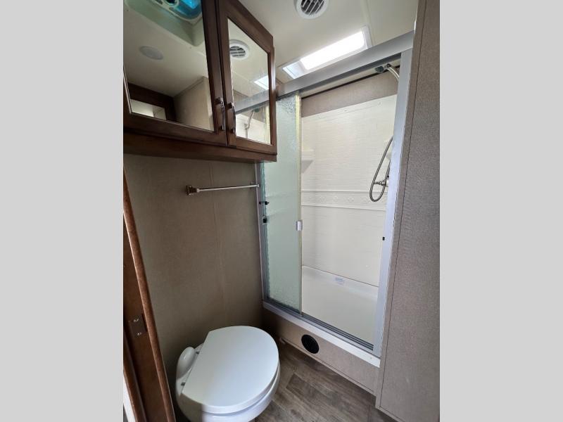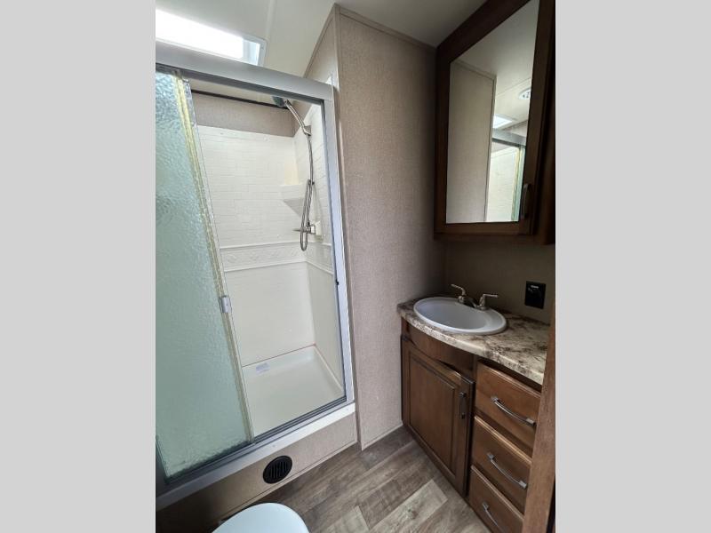 As you enter you will find yourself across from the side aisle bathroom with a shower including a skylight, sink with overhead cabinet, and linen storage over the toilet. Now that's convenient when needing a quick break after playing outside.