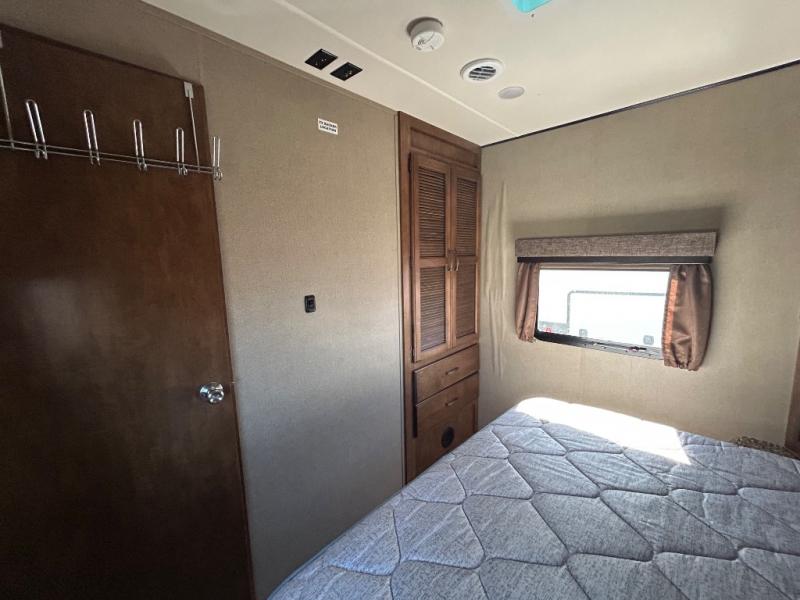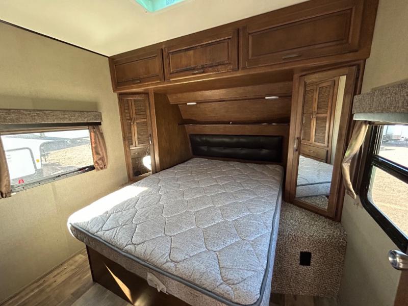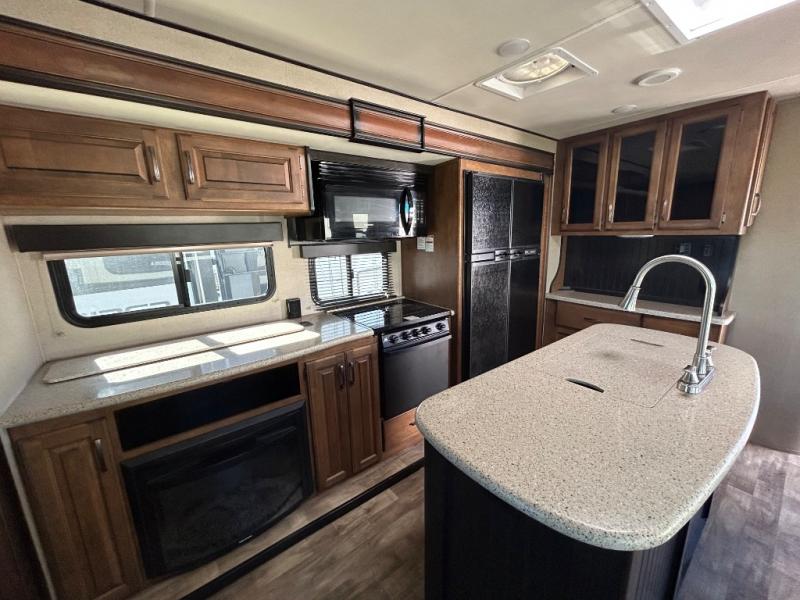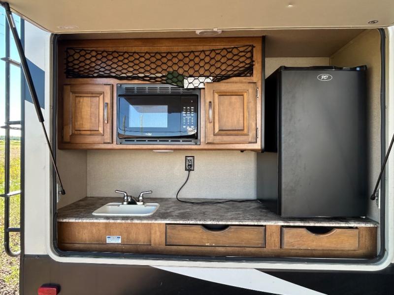 A generous exterior unobstructed pass-through storage compartment in the front makes it easy to store all of your outdoor camping gear. The all-in-one docking station comes in handy too. Along the curb side near the rear enjoy an outdoor kitchen which features a sink, microwave, two burner cooktop, overhead storage, a refrigerator, plus more!