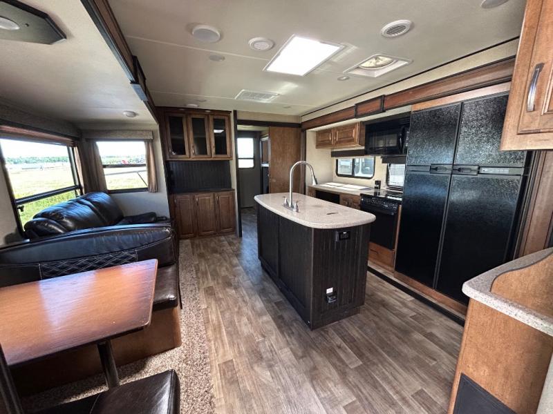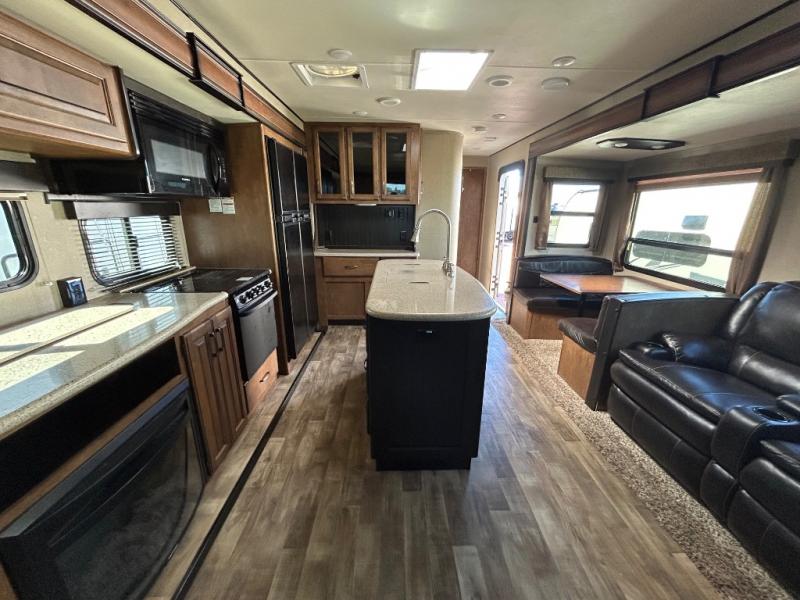 Head back to the wide open kitchen and living space with dual opposing slides. There is a slide out booth dinette or choose a free standing dinette option, plus theatre seating or choose a tri-fold sofa option next to the entry door. The second slide provides a three burner range, convection microwave, refrigerator, and an entertainment center with telescoping 40" TV with fireplace below for those cooler nights. There is also a center kitchen island with a large sink, and plenty of counter space for preparing meals or cleaning up. You are sure to appreciate the extra storage provided by the two hutches.