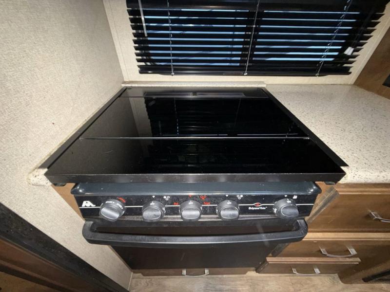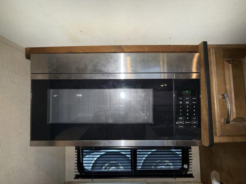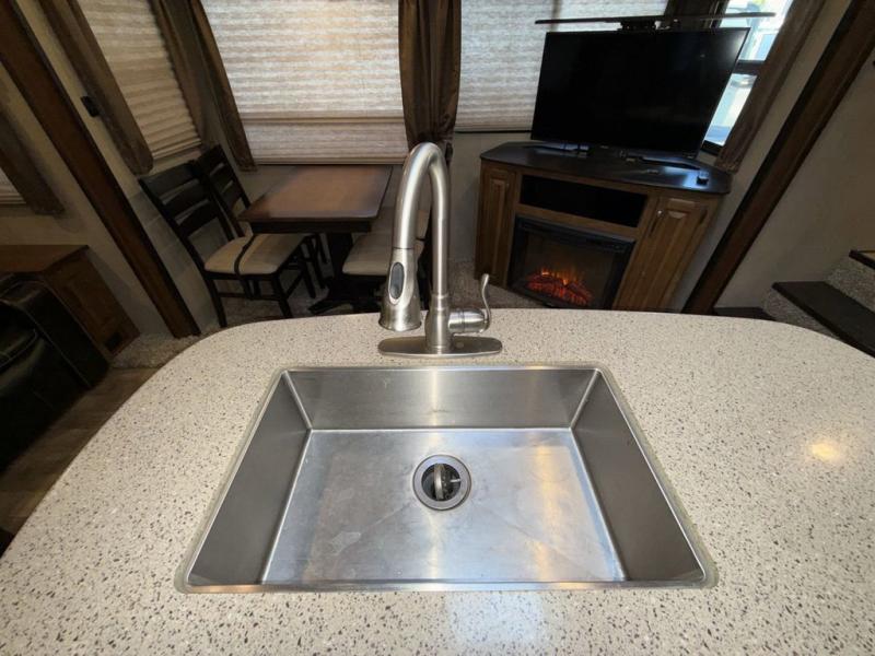 The second slide out along the curb side wall includes a refrigerator, and three burner range with convection microwave plus overhead storage for your dishes and things. Along the interior wall find a countertop for preparing or serving meals with additional overhead storage, plus lower cupboards and drawer space. A much desired kitchen island includes a large single sink, extra counter space and storage.