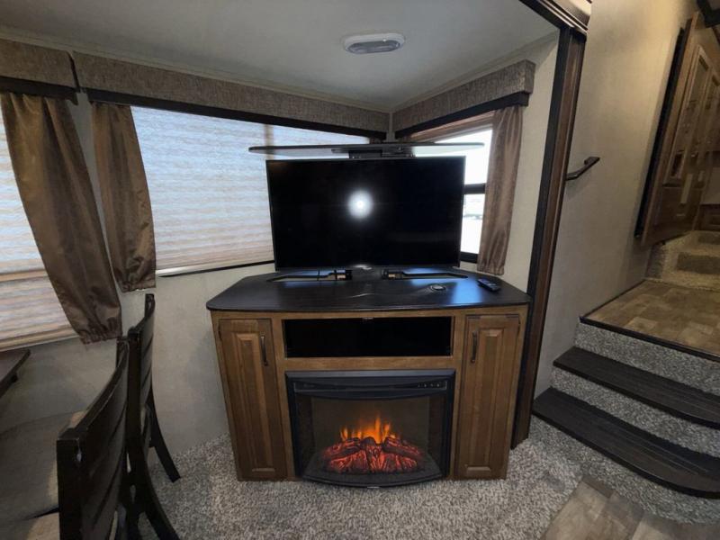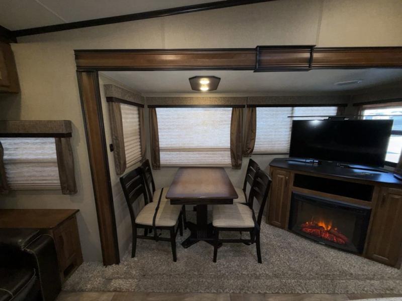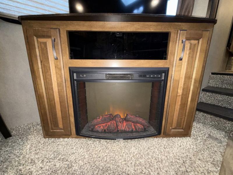 Step inside to the spaciousness with dual opposing slide outs on either side of the unit. To your left is the rear wall with theatre seating and end tables, or optional tri-fold sofa. The first slide features a free standing dinette along with a 40" telescoping LED TV, entertainment center and fireplace.