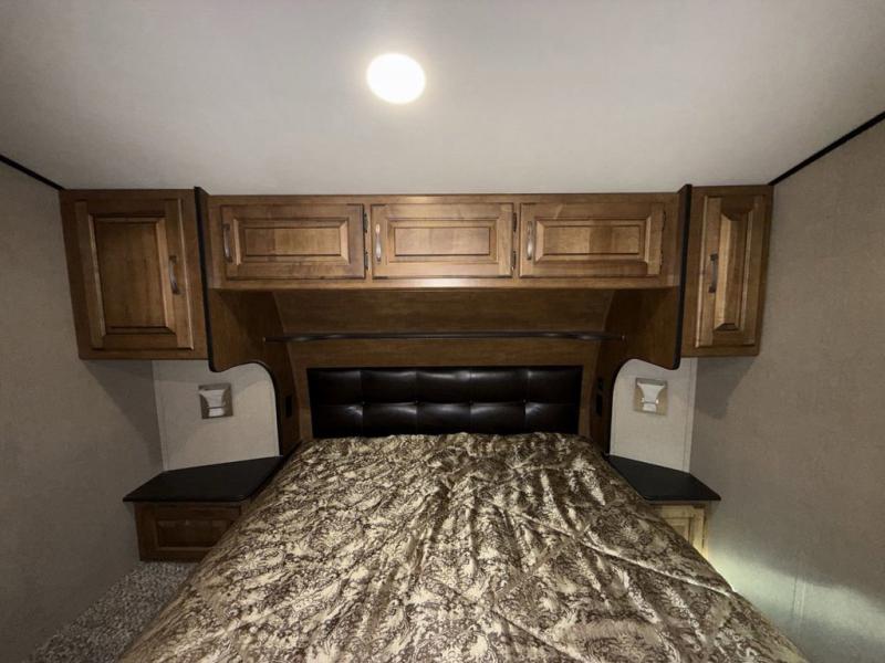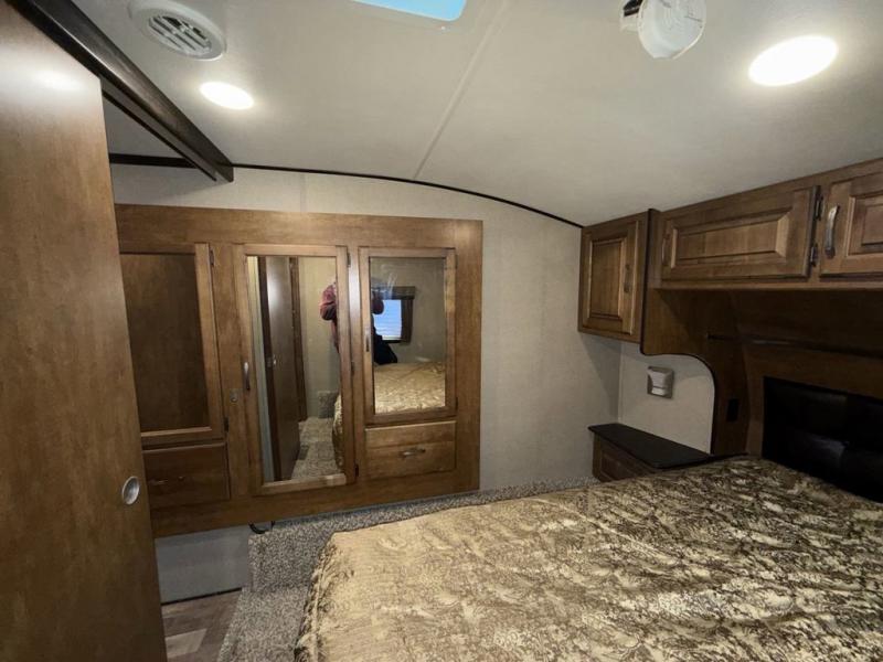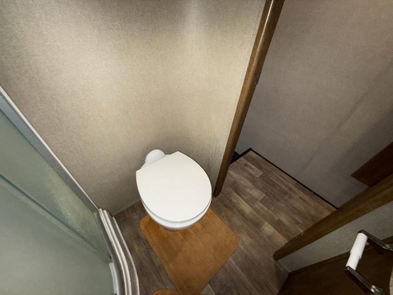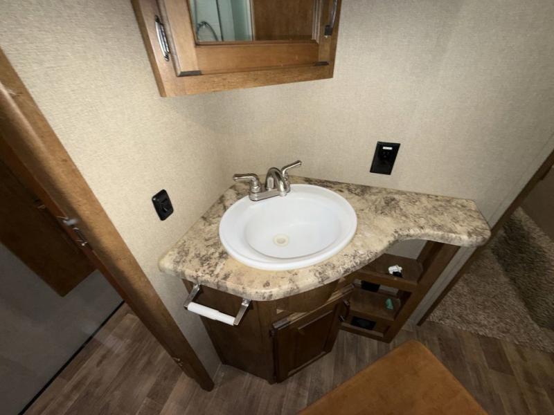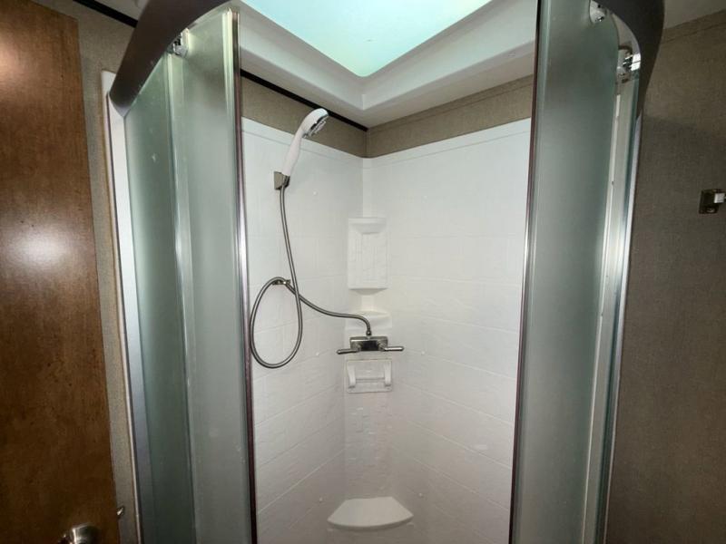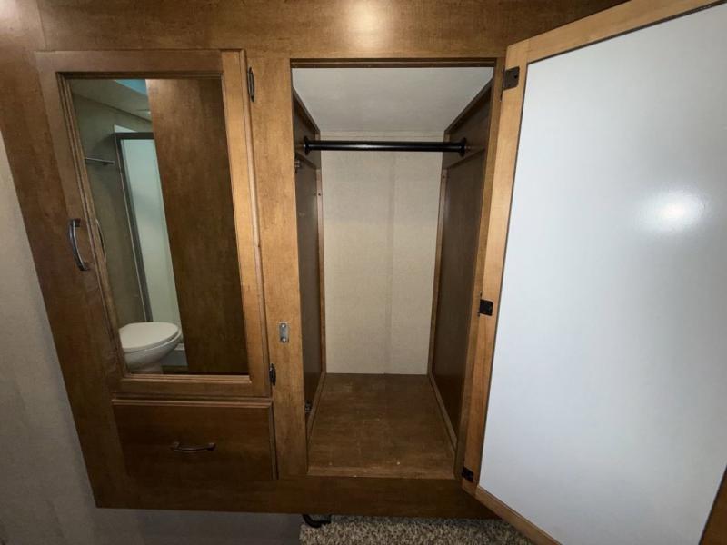 Head up the steps towards the front of the fifth wheel to a side aisle bath on your right. The bathroom includes a radius shower including a skylight, toilet, and a vanity with sink. The bath also features a second entry door that slides open to allow access into the master bedroom. There is also access to a linen cabinet with drawer in the hallway within the bedroom slide out.