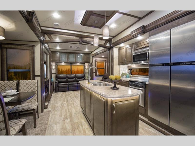 Center Island! Tri-Fold Sofa!Step inside and notice how open and spacious the kitchen is. There are dual opposing slides in this area alone with the first slide to the left of the entry door featuring a free standing dinette. Opposite you will find a slide out 18 cu. ft. refrigerator, a three burner range with overhead microwave oven, and overhead cabinetry with a bit of counter space. You will love the center island which features a double sink, plenty of prep space, and it has also been prepped for a dishwasher. Add this option and spend more time outdoors rather than doing the dishes after each meal! To finish out the kitchen, along the interior wall, you will find a pantry, plus more counter and storage space for your dry goods and daily dishes.