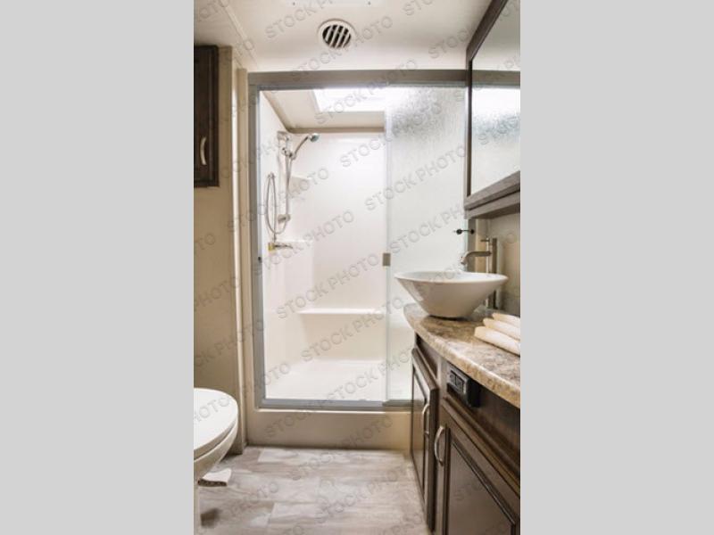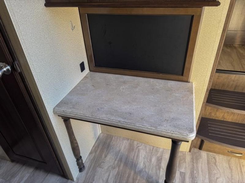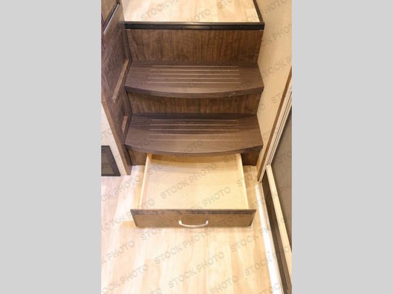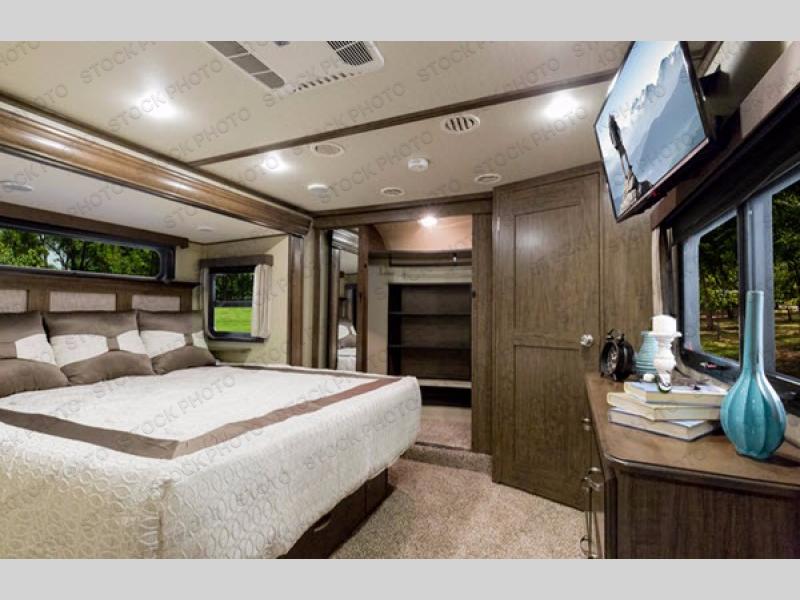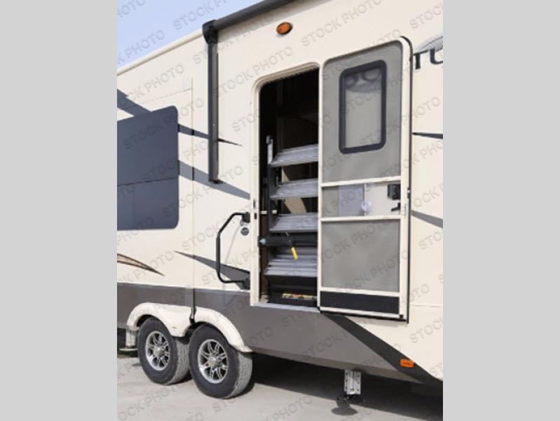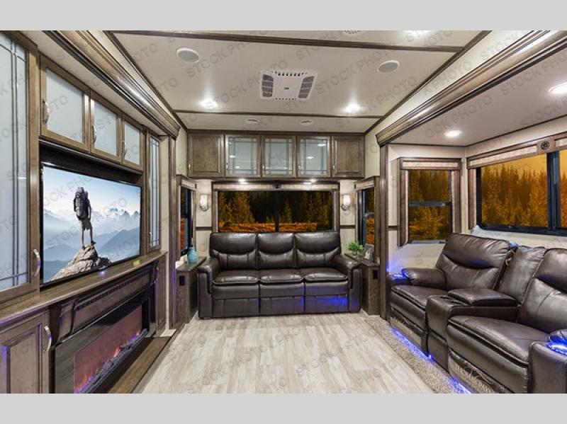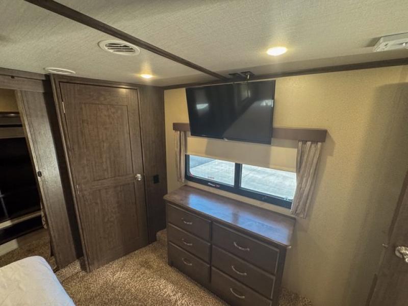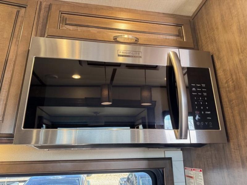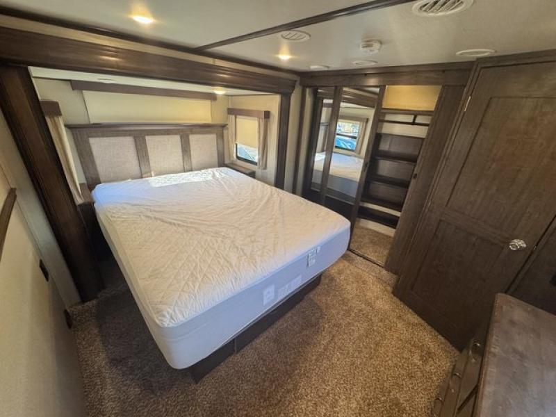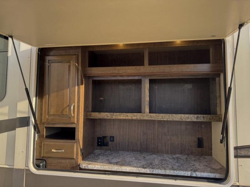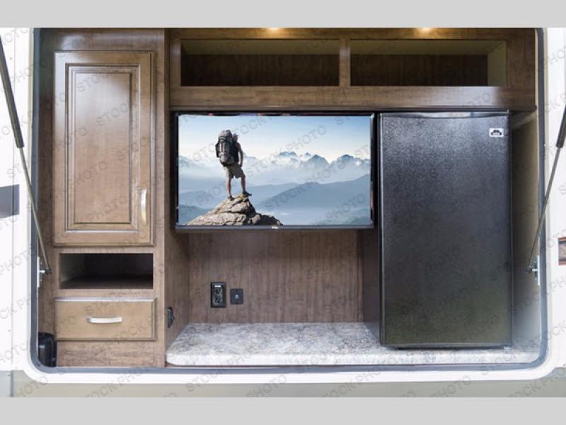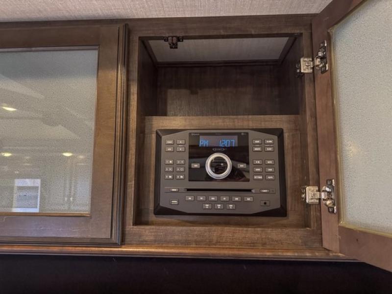 Outside enjoy an exterior LED TV and refrigerator to keep cold drinks handy. You will also love the unobstructed pass-through storage compartment for all of your outdoor camping items, plus universal docking station, and so much more!