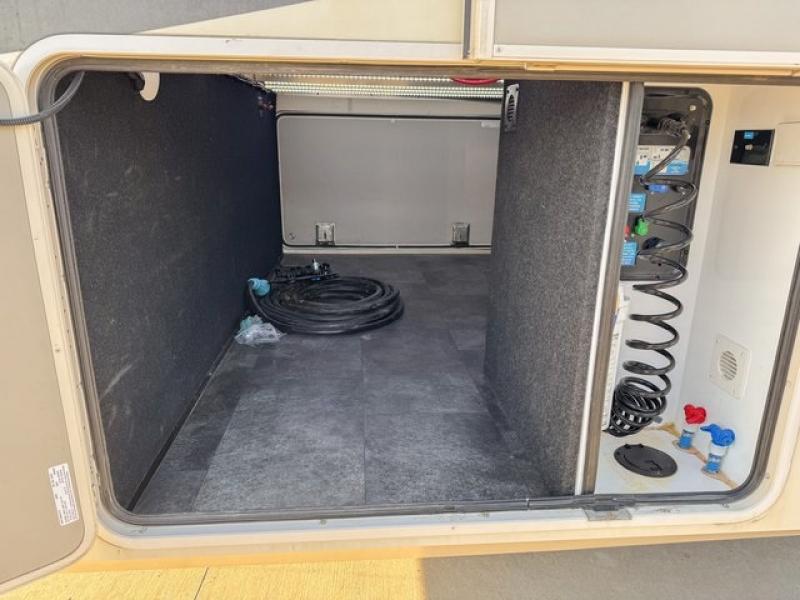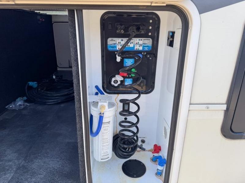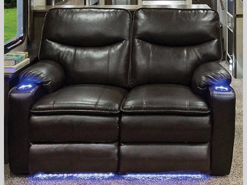 Back through to the rear of this unit you will find a living area including a slide out theatre seat along the road side, a slide out entertainment center with LED TV and fireplace opposite, plus a tri-fold sofa including overhead cabinets along the rear wall. This can also become added sleeping space for overnight guests.