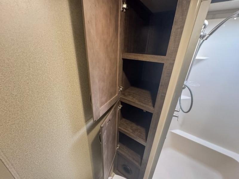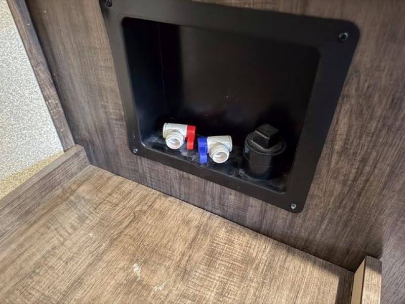 Just outside the bathroom there is a door to the front private bedroom. Here you will enjoy plenty of room thanks to a slide out queen bed including a pull-out ottoman. There is a full front wardrobe for your hanging clothes, shirt storage, a dresser, and a closet that has been prepped for a washer and dryer. No pile of dirty laundry to take home here when you choose this option.