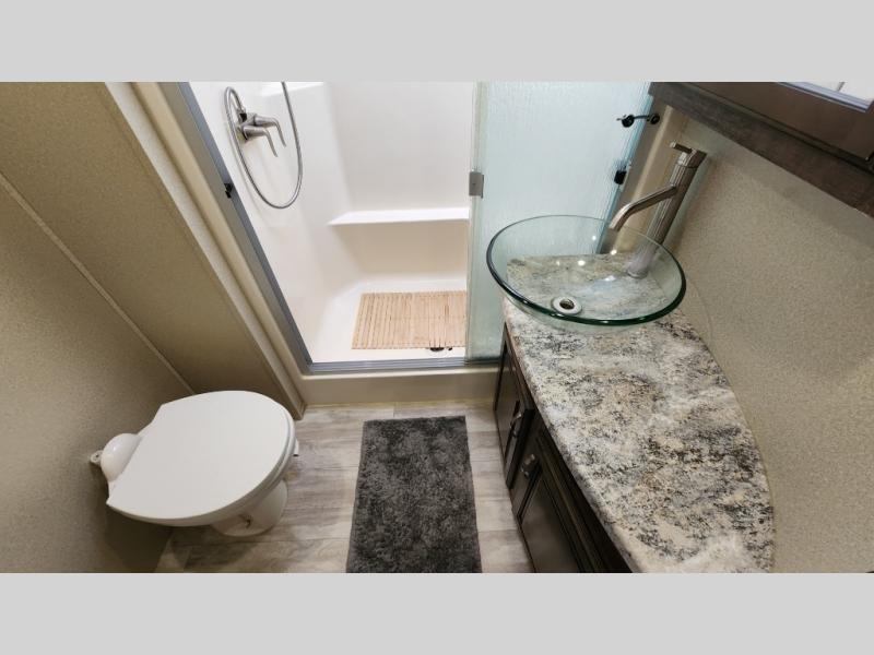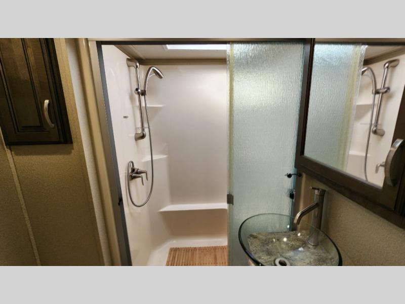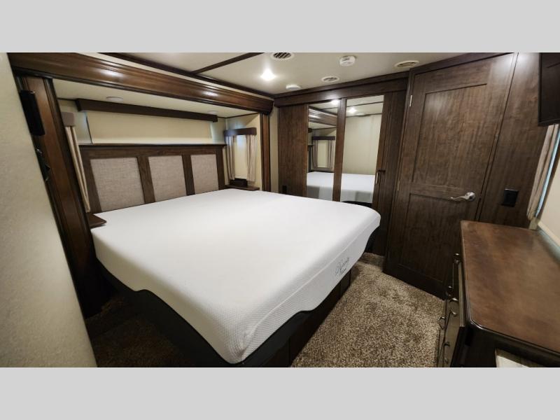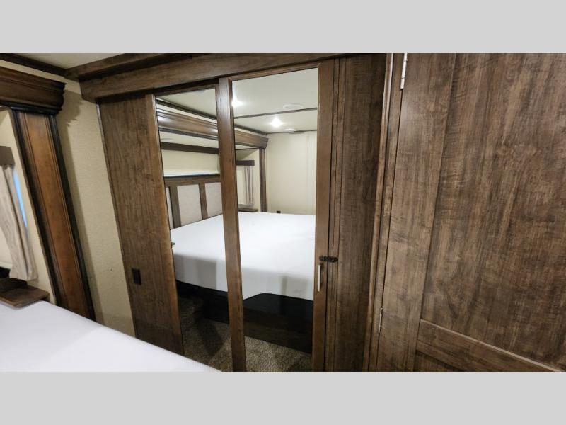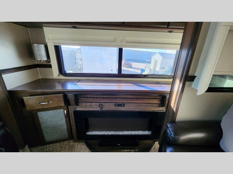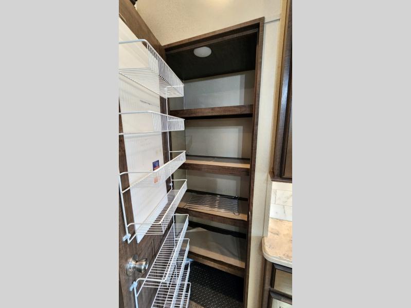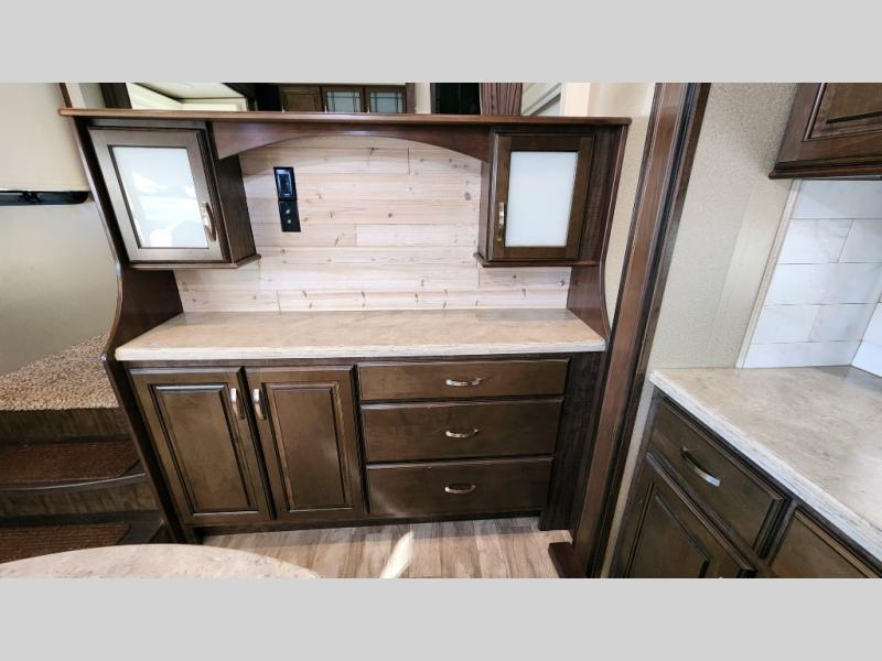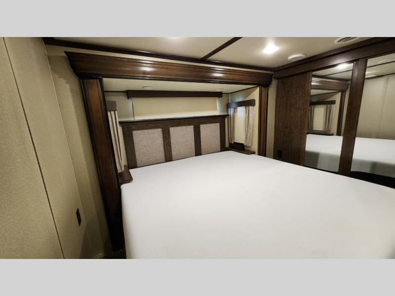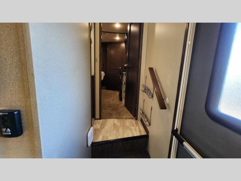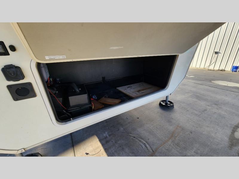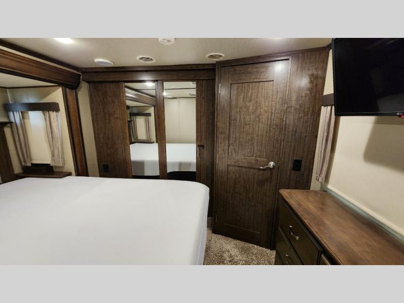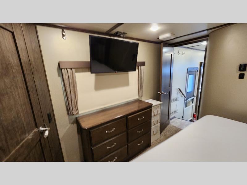 Outside enjoy an exterior LED TV and refrigerator to keep cold drinks handy. You will also love the unobstructed pass-through storage compartment for all of your outdoor camping items, plus universal docking station, and so much more!