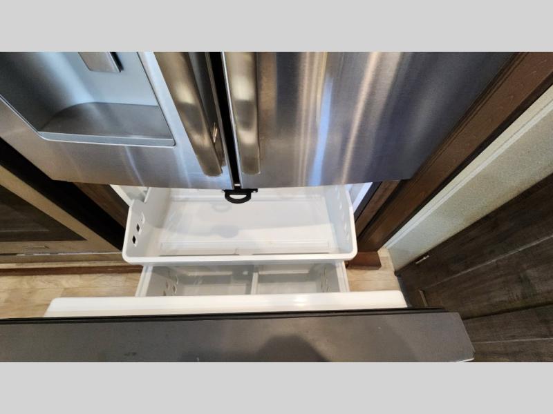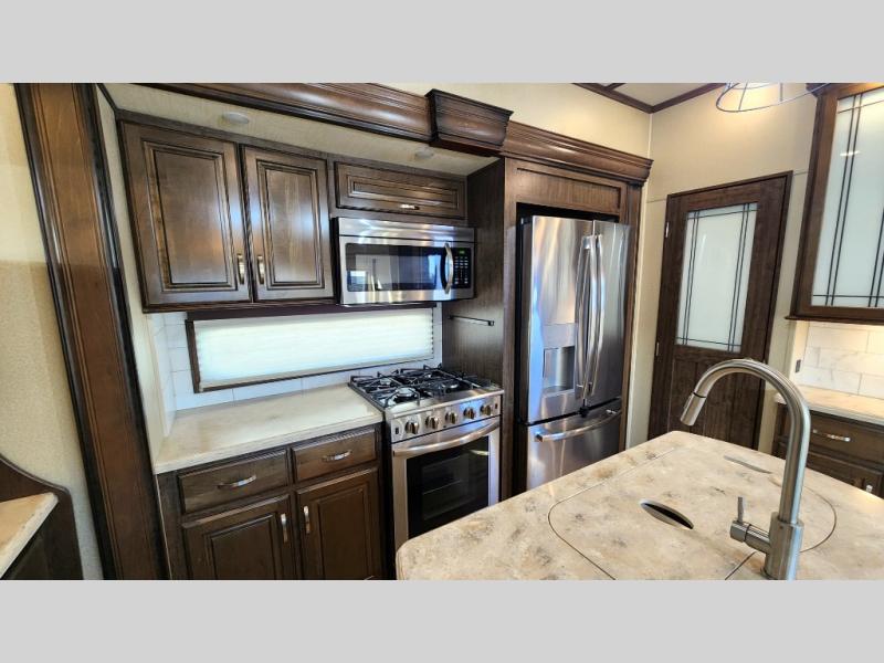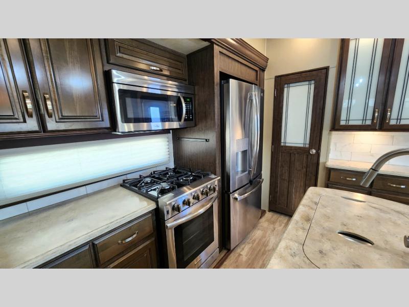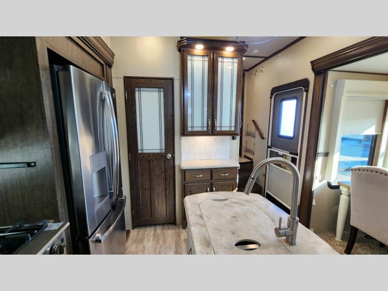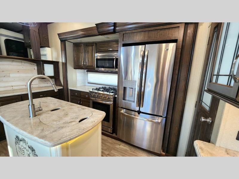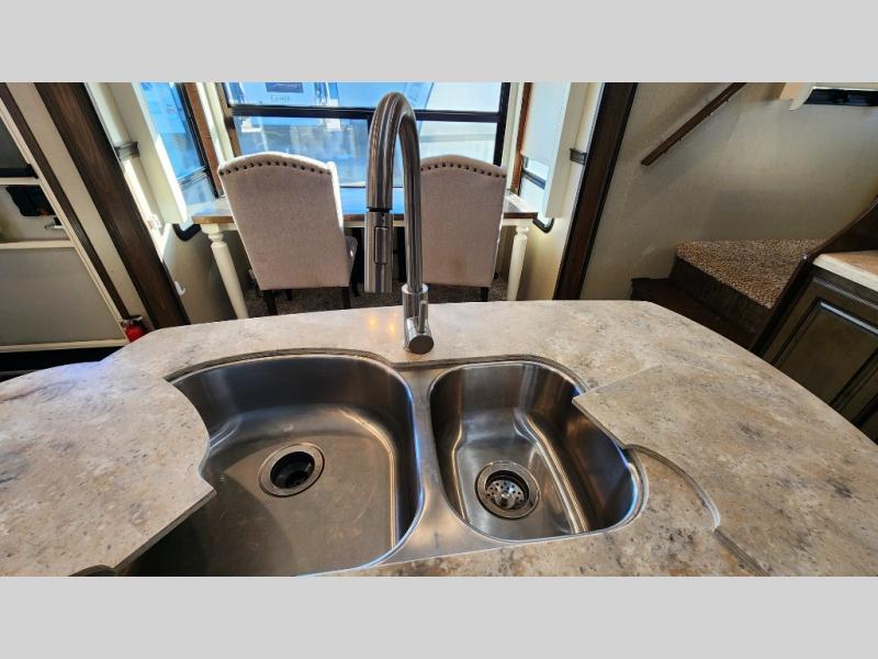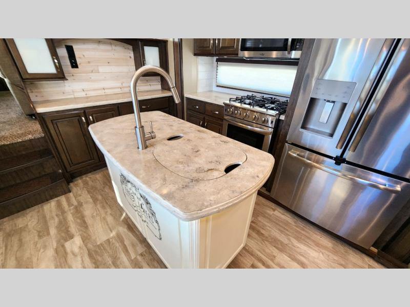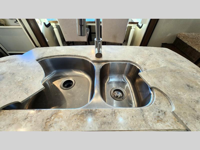 Step inside and notice how open and spacious the kitchen is. There are dual opposing slides in this area alone with the first slide to the left of the entry door featuring a free standing dinette. Opposite you will find a slide out 18 cu. ft. refrigerator, a three burner range with overhead microwave oven, and overhead cabinetry with a bit of counter space. You will love the center island which features a double sink, plenty of prep space, and it has also been prepped for a dishwasher. Add this option and spend more time outdoors rather than doing the dishes after each meal! To finish out the kitchen, along the interior wall, you will find a pantry, plus more counter and storage space for your dry goods and daily dishes.