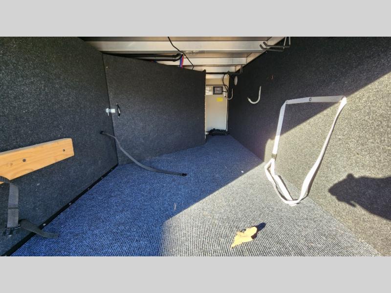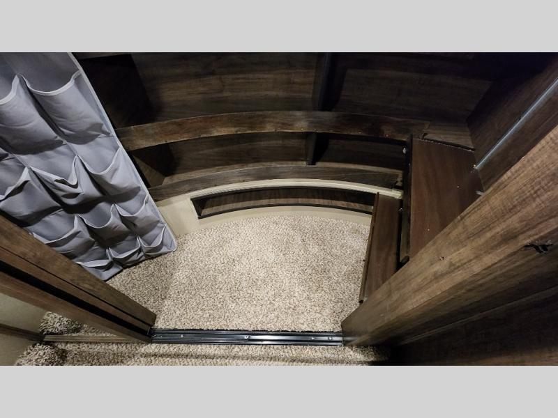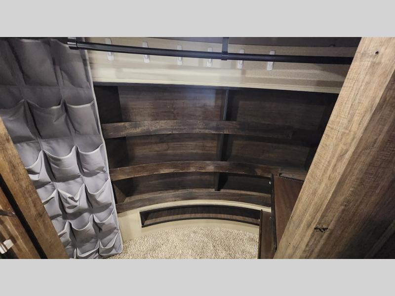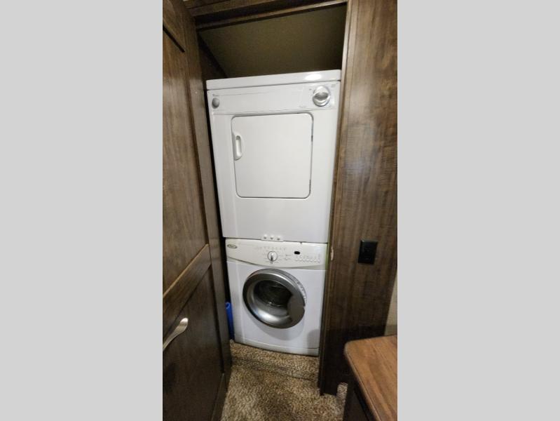 Just outside the bathroom there is a door to the front private bedroom. Here you will enjoy plenty of room thanks to a slide out queen bed including a pull-out ottoman. There is a full front wardrobe for your hanging clothes, shirt storage, a dresser, and a closet that has been prepped for a washer and dryer. No pile of dirty laundry to take home here when you choose this option.