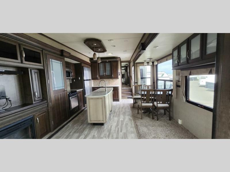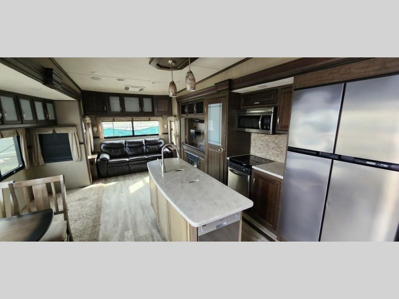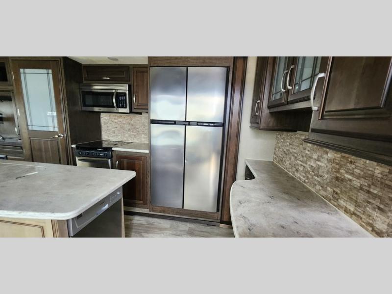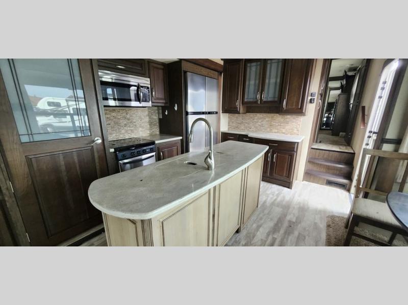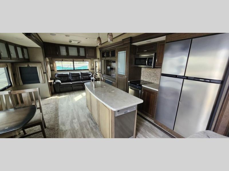 Enter this Solitude fifth wheel 369RL-R by Grand Design and be amazed at the wide open space you see with dual opposing slides in the combined kitchen and living area.