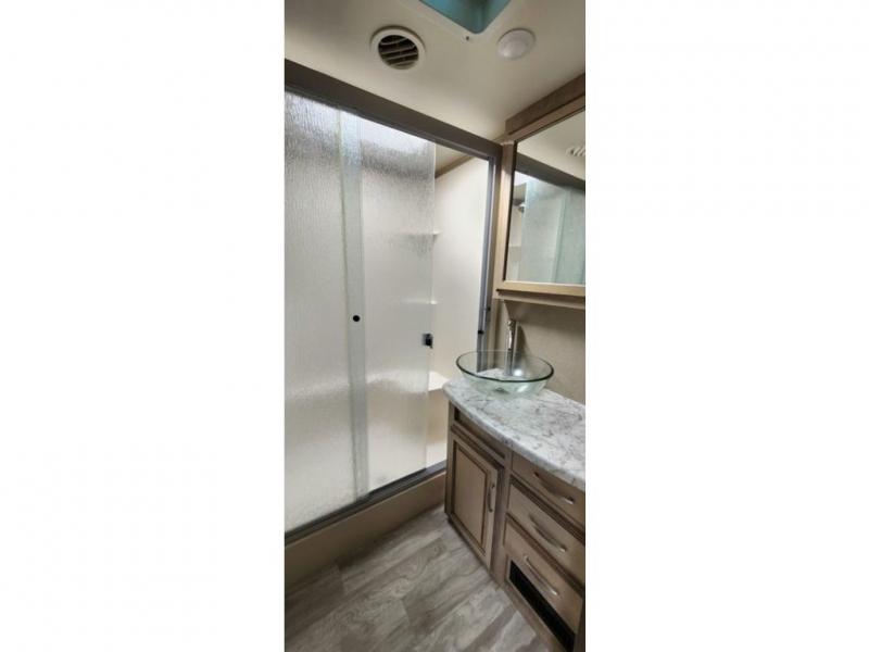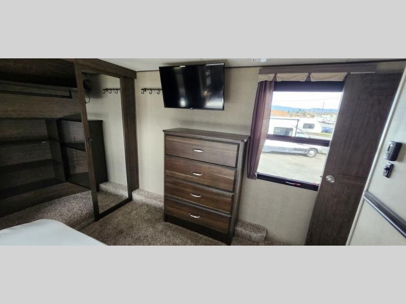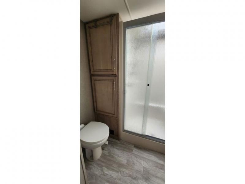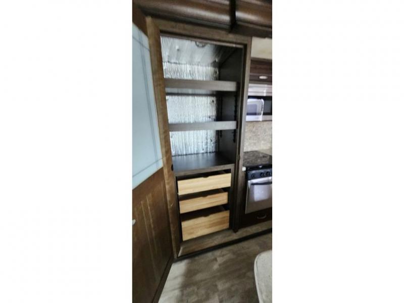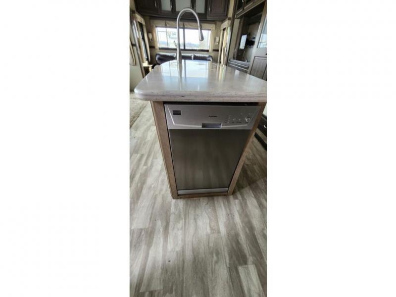 Enjoy the tri-fold sofa along the rear wall featuring overhead cabinets and end tables. The entertainment center is located in the road side slide featuring an entertainment center including a LED TV with fireplace below. Along with the entertainment center there is also a large pantry for storing dry goods, a three burner range, microwave, counter space, and a residential refrigerator. The convenient kitchen island provides a bit more counter space and dual sinks making cleanup and food prep a breeze. You may choose an optional dishwasher if you like.