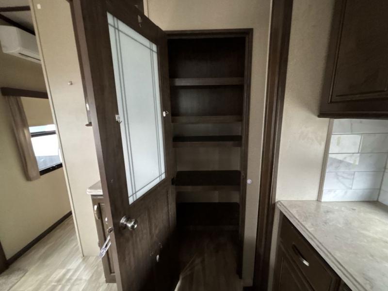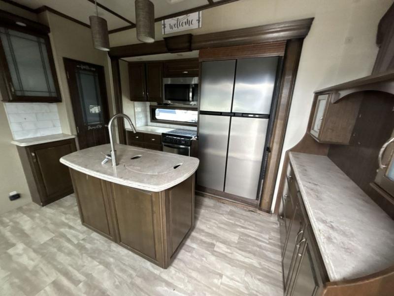 Step inside the entry door closest to the front. As you enter you are in a spacious kitchen featuring dual opposing slides. To your left there is a slide out free standing dinette table and chairs. There is a center island with double sinks including counter space. You will find even more counter space along the interior wall with the hutch, plus the pantry and overhead cabinets on the opposite wall provide extra storage. The slide opposite the dinette features a three burner range with overhead microwave oven, counter space, and an 18 cu. ft. refrigerator.