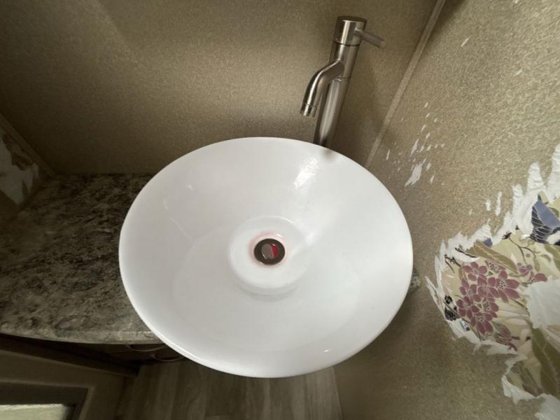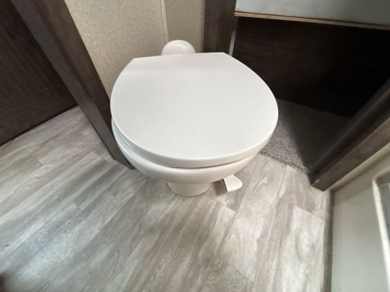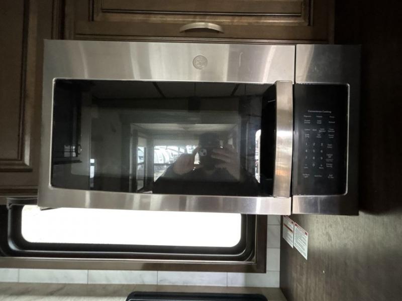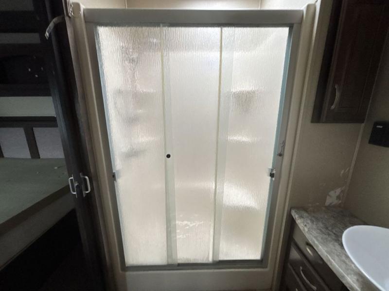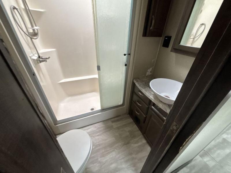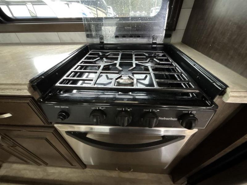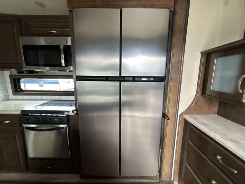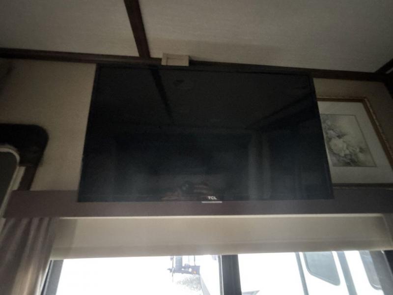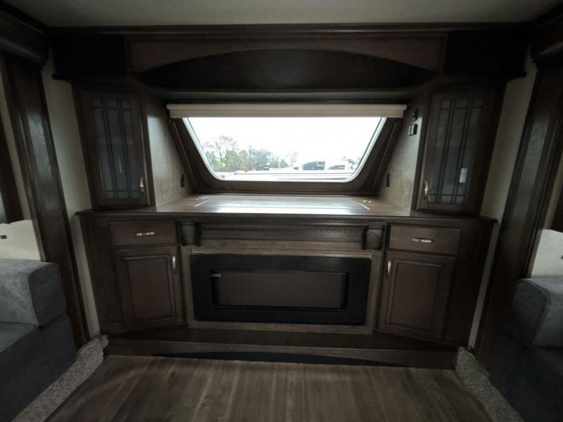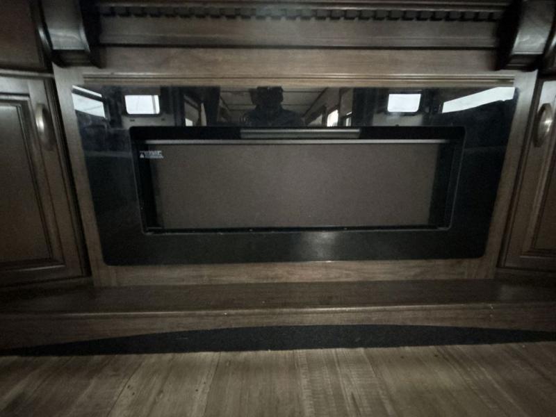 The front living area also provides dual slides with tri-fold sofas. There is theatre seating for two to the left as you enter the living space, and a LED TV at the front of the room with a fireplace below. The perfect space for entertaining guests and enjoying a conversation with family and friends.