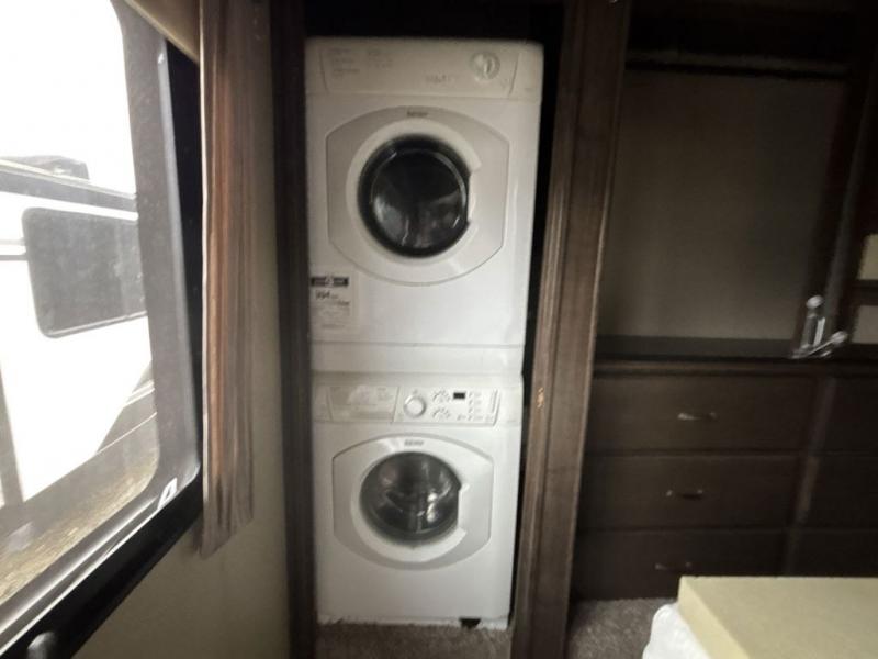 The rear private bedroom includes its own entry door from outside. The bedroom also features a standard queen size bed slide out, or you may choose an optional king. There is a pull-out ottoman at the foot of the bed, and a LED TV on the opposite wall. Along the rear wall of the bedroom you will find a closet with drawers, shelves, and a space prepped for a washer and dryer if you choose to add stackable units.