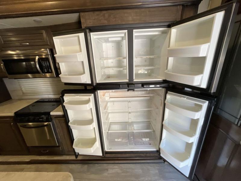 The slide opposite the door side features an entertainment center with a LED TV and fireplace. There is also a three burner range and microwave for cooking with counter space on either side, plus an 18 cu. ft refrigerator for your perishables within the slide out. There are two handy pull-out trash cans as well. Along the interior wall find a pantry, and a desk with overhead storage. And don't forget about the kitchen island with double sinks, extra counter space and storage, plus a space for an optional dishwasher.