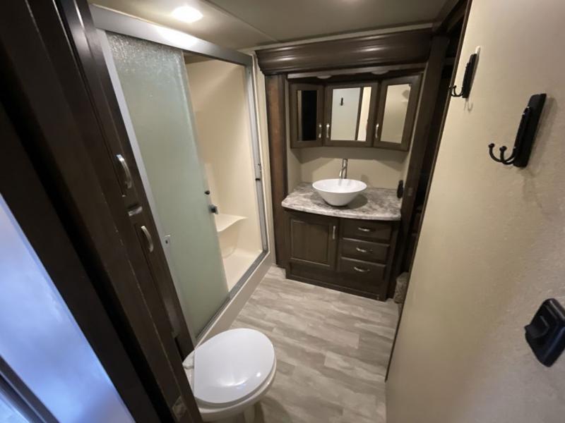 Head up the steps to a front bedroom and bath. The bath offers a large shower with seat and skylight, plus a toilet and linen cabinet. There is also a slide out vanity with sink and medicine cabinet which is attached to the bedroom slide out giving you much added space. A second bath entry door slides to provide easy access to the bedroom.