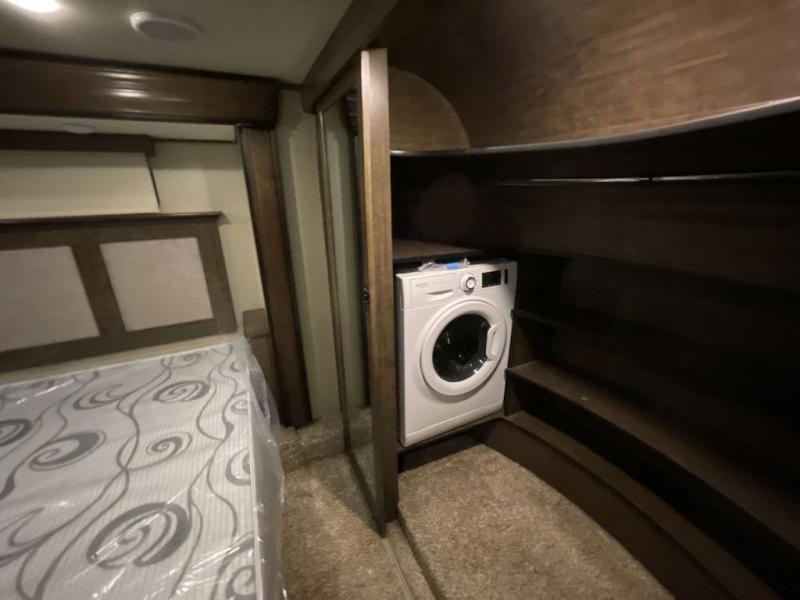 You can also enter the front bedroom from the hallway door. Here you will find a slide out dresser and LED TV on your right. Opposite enjoy sleeping on a slide out KING size bed with pullout ottoman off the foot of the bed, and a full front closet with shirt storage. It is also prepped for a washer and dryer if you choose to add the units.