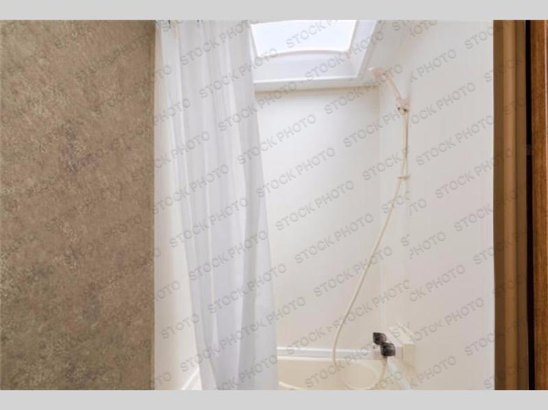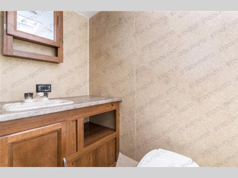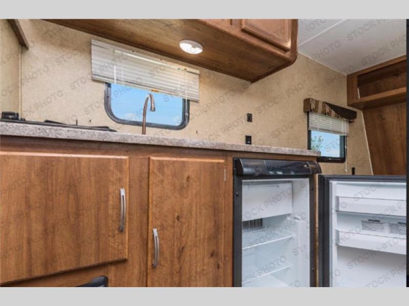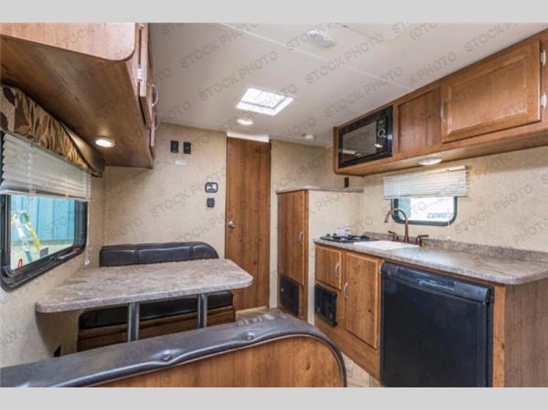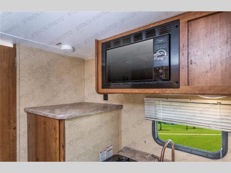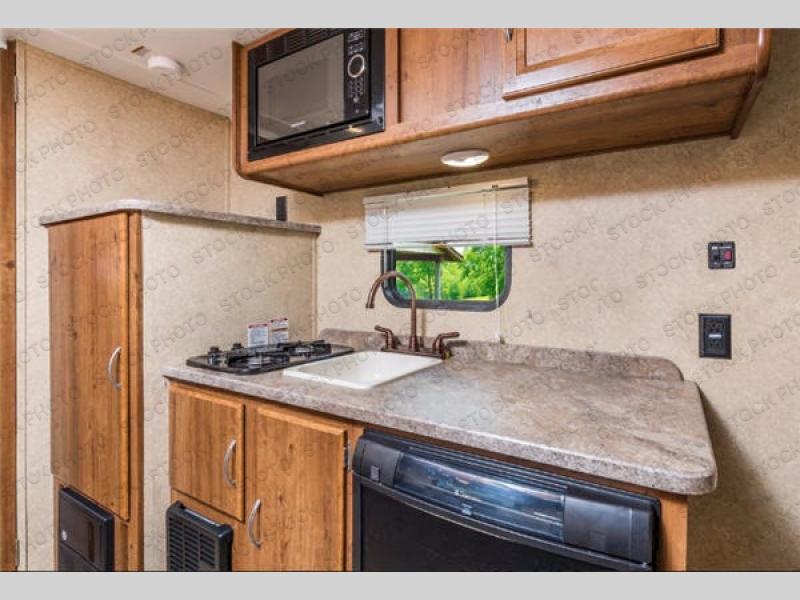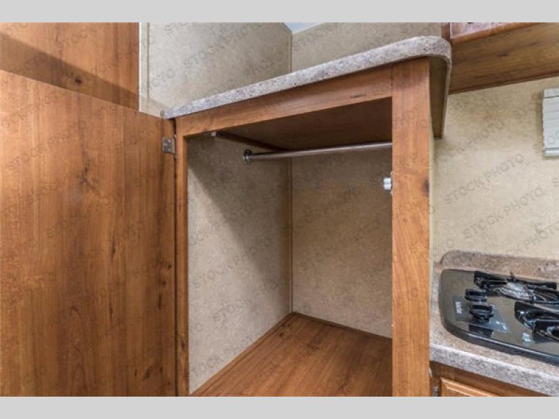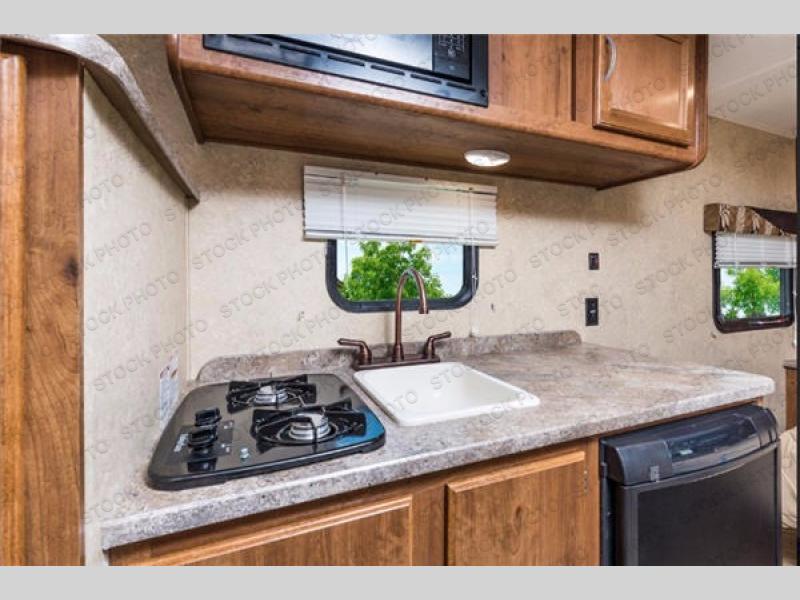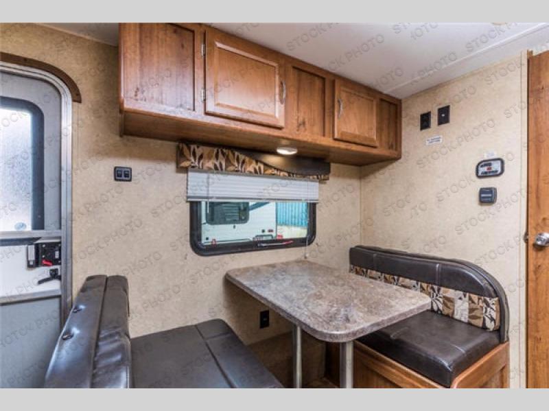 To the left of the main entry door enjoy dining at the booth dinette which also includes overhead storage. Opposite the dinette you will find a refrigerator beneath the counter-top, a single sink, and a two burner cook-top with overhead microwave oven. There is also a pantry for all of your food storage and/or clothing storage needs.