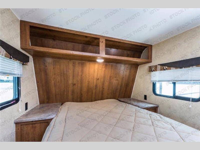 Step inside to find a queen flip-up bed with dual nightstands, and an overhead storage shelf for your things.