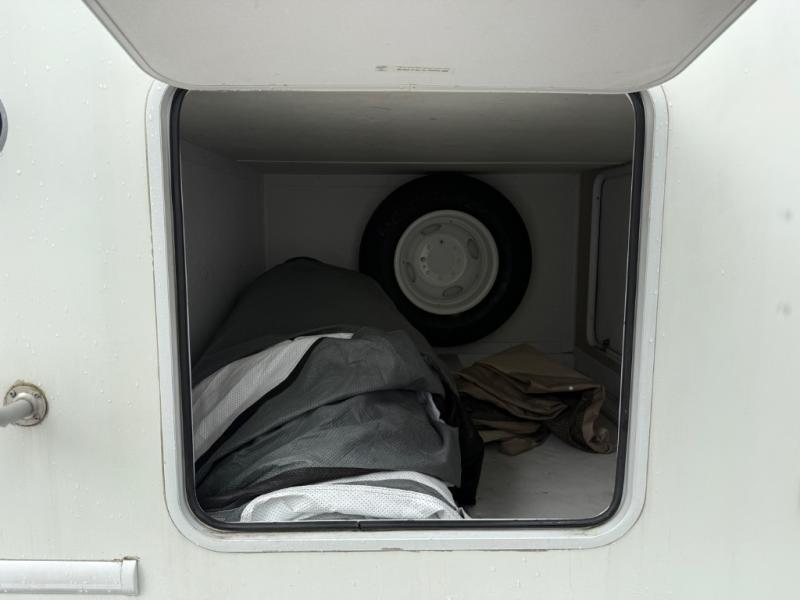 Heading inside you will also find ample storage with overhead cabinets throughout. There is a bunk above the cab area with a TV mount, plus storage and cabinets across the entire front for your things.