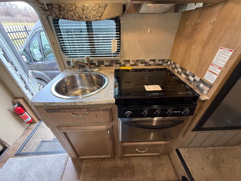 To the left of the side entry door you will find a round single sink with flip up counter extension, a three burner range, overhead microwave oven, storage, and a stainless steel refrigerator for your perishables.