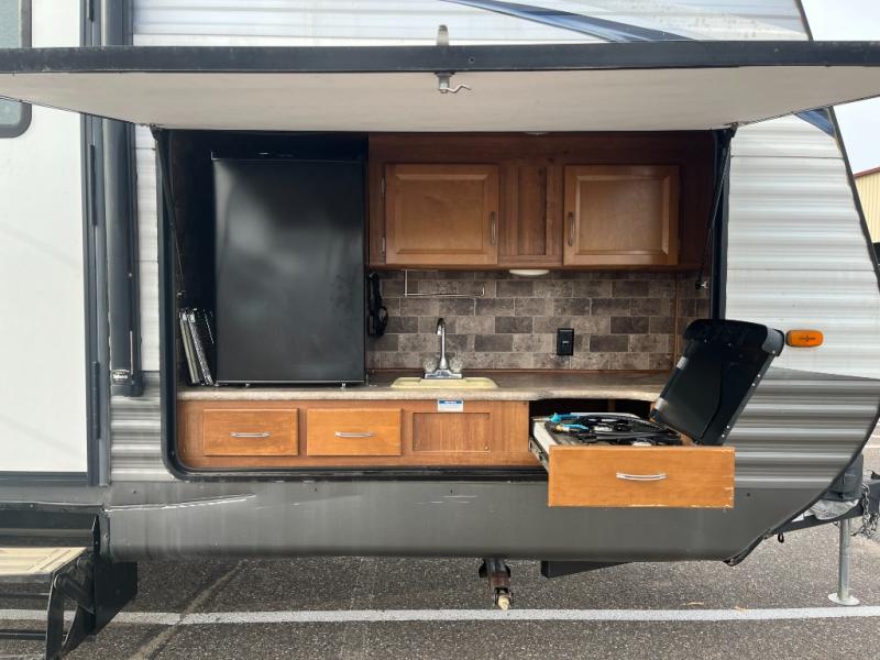 Before you enter notice the optional outside kitchen shown which features storage, a single sink, refrigerator, pull-out two burner stove top, and counter space. The perfect addition for the chef in the family.