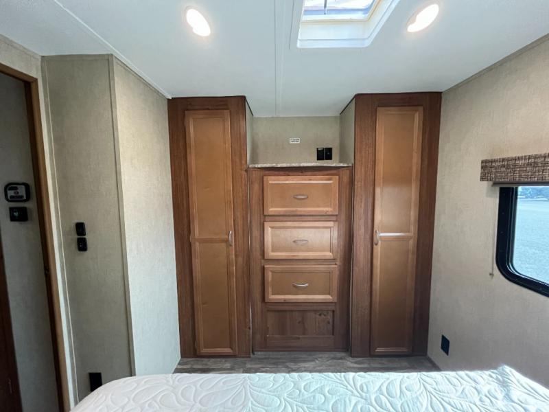 Just beyond the bathroom is the rear bedroom with slide out queen size bed including overhead storage. There is also a vanity that features a wardrobe on either side, and so much more!