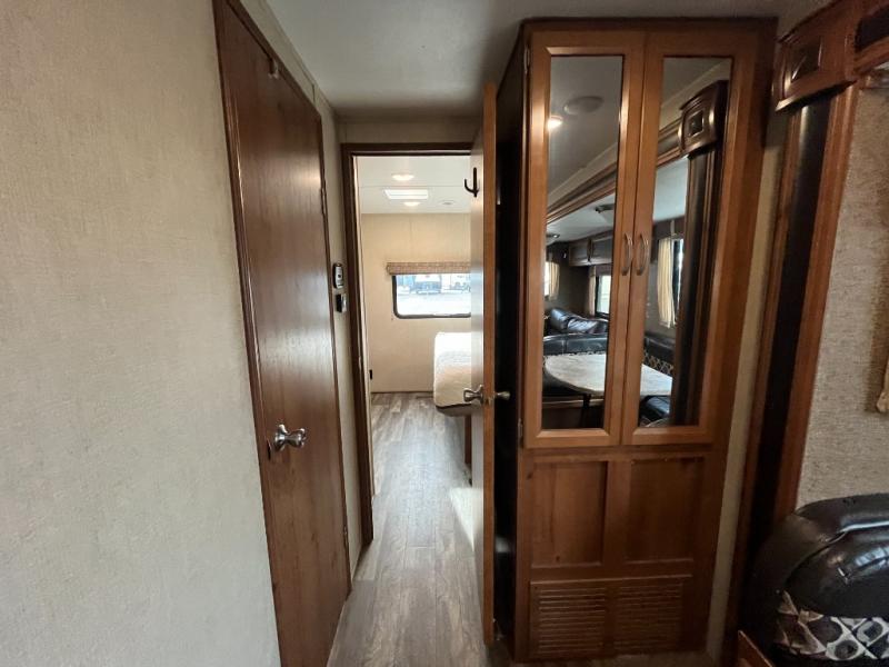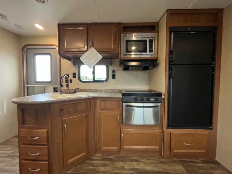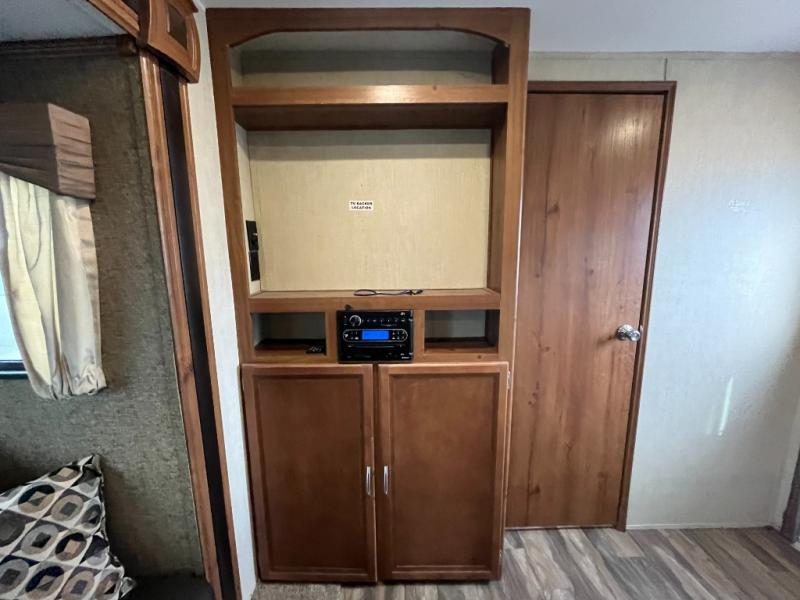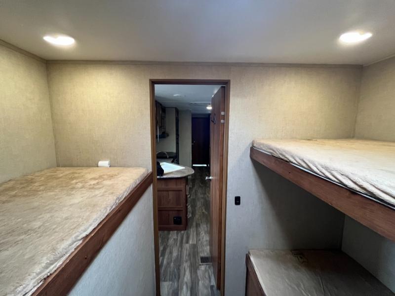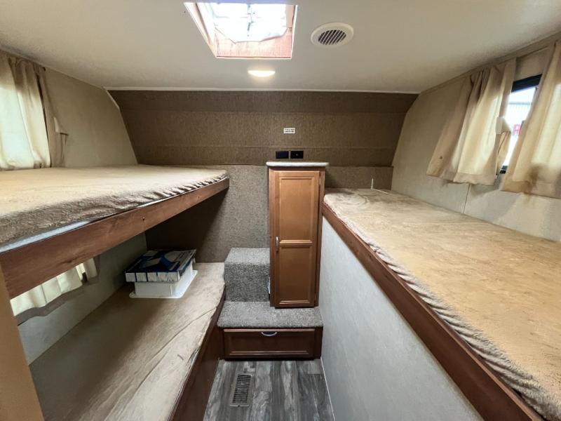 Step inside and see a front bunk room with one set of bunks on the left, a center wardrobe, and an overhead bunk on the right. There is an entertainment center just outside the bunk room door that can easily be viewed from any seating in the space.