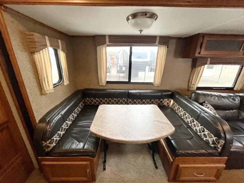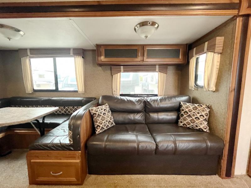 The slide out features a sofa and u-shaped dinette. Both can be used for additional sleeping space at night, and they offer ample seating during the day for mealtime and/or just hanging out.
