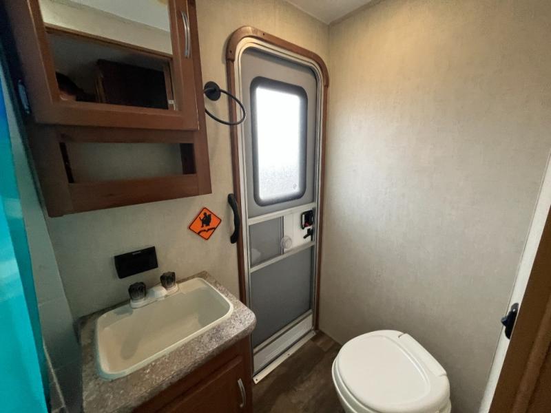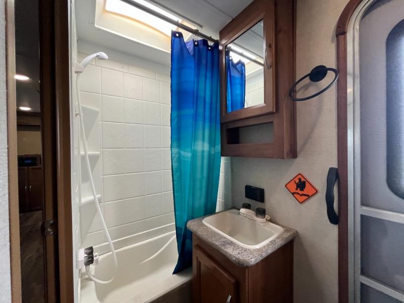 There is a bath that offers a tub/shower, toilet and sink. It also has an exterior door for added convenience.
