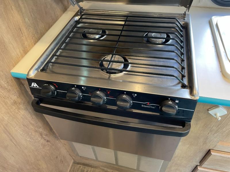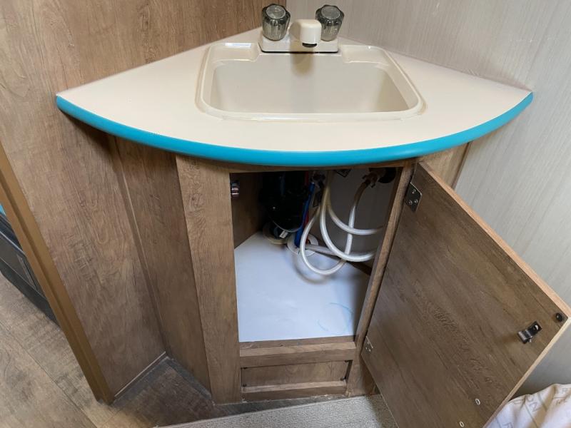 The kitchen amenities allow you to easily create meals and snacks while you travel. There is a double kitchen sink, a two burner cook-top with overhead microwave oven, and cabinets for your dishes and things. There is also a refrigerator along the road side for your perishables.