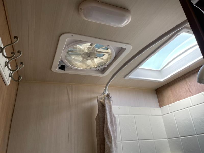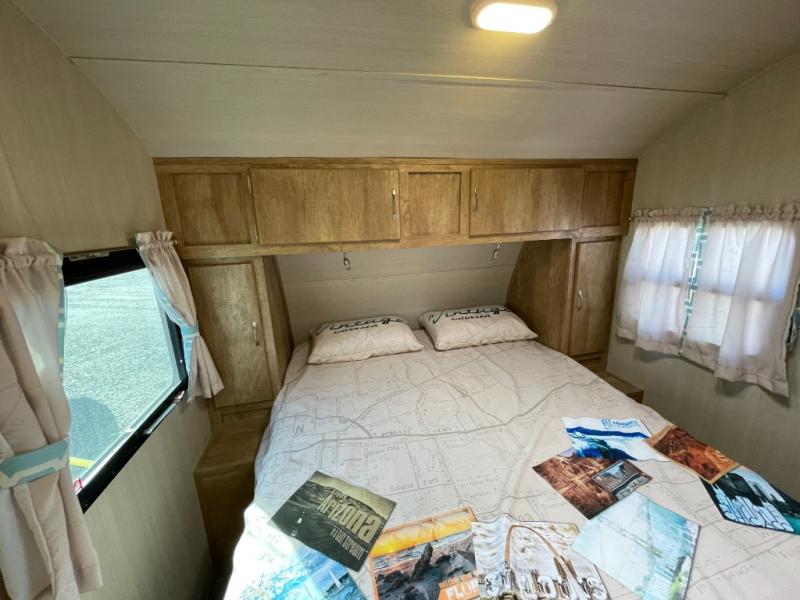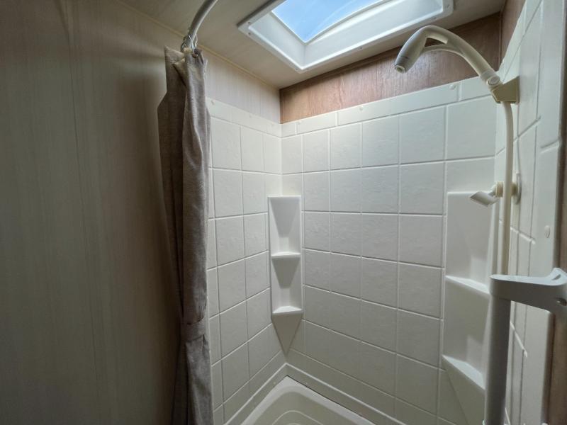 In the very front of the trailer you will find a private tub/shower and toilet. The bath sink can be found opposite, on the front facing side of the refrigerator.