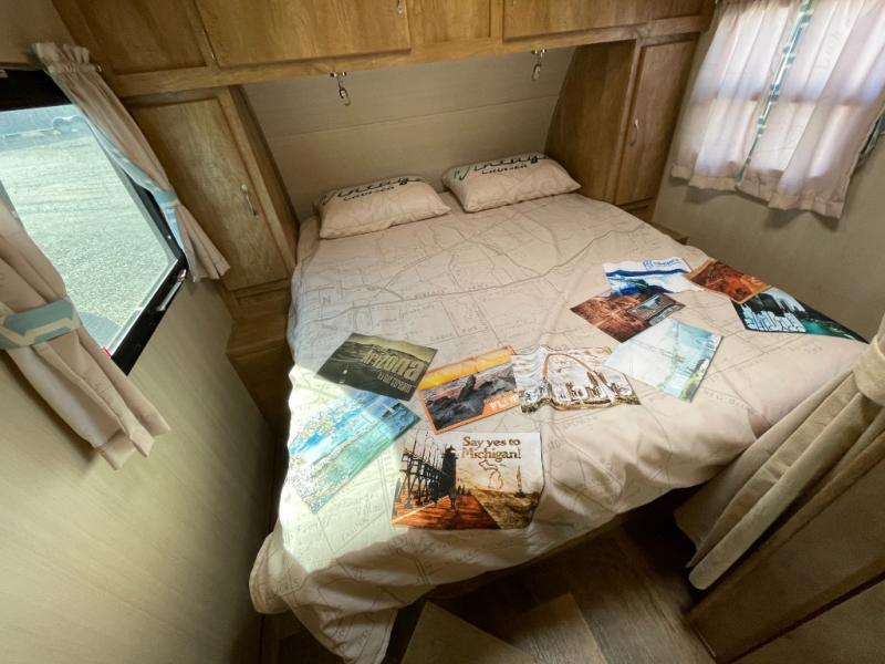 The bedroom area features a queen size bed, dual bedside shirt closets, and overhead cabinets for your things. There is also a curtain that can be pulled when you would like a bit more privacy.