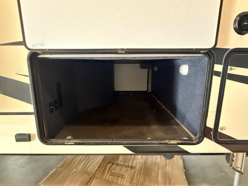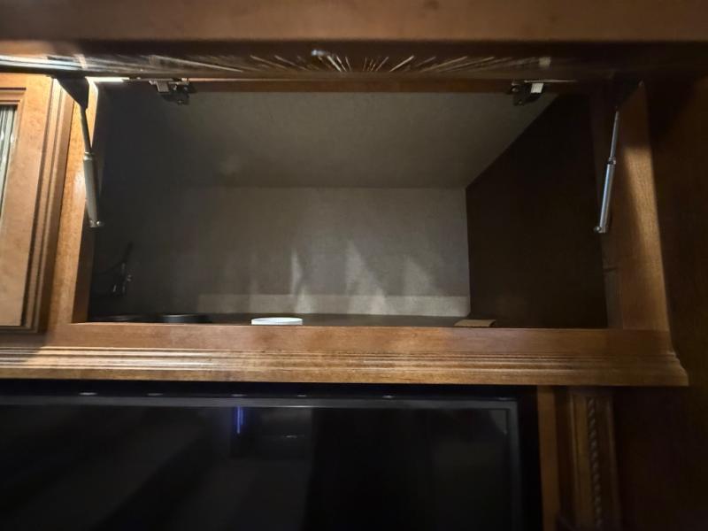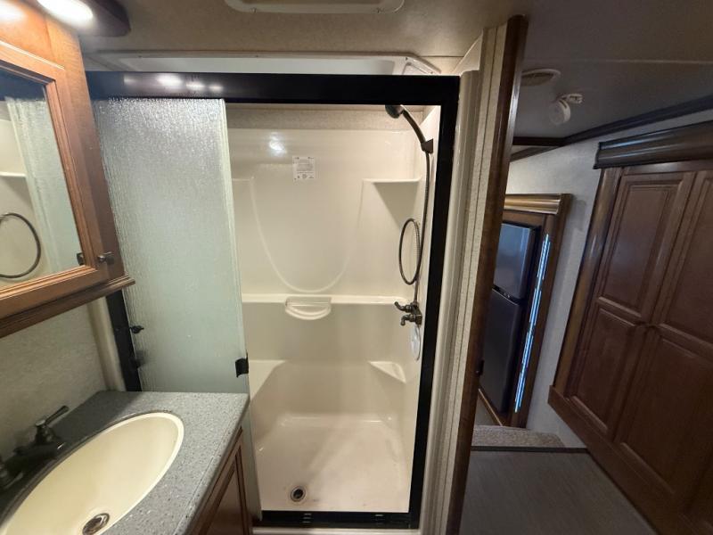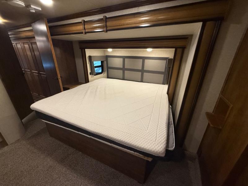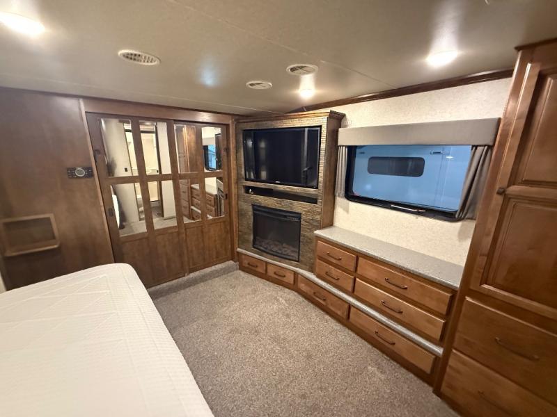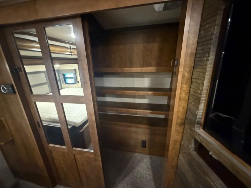 The slide out continues into the bedroom with a nightstand, and another slide out within the hallway slide allowing the king size bed to be pushed out further for more walking around room. You may choose an optional queen bed instead as well. The front full wall closet has sliding doors, storage drawers, and space to hang your clothes which comes in handy on those longer stay vacations. There is also a dresser opposite the bed along with a storage closet and drawers, plus a location for an optional TV and fireplace along the curb side wall allowing plenty of room for all your camping clothes, plus so much more!