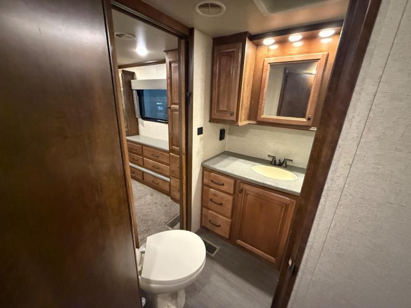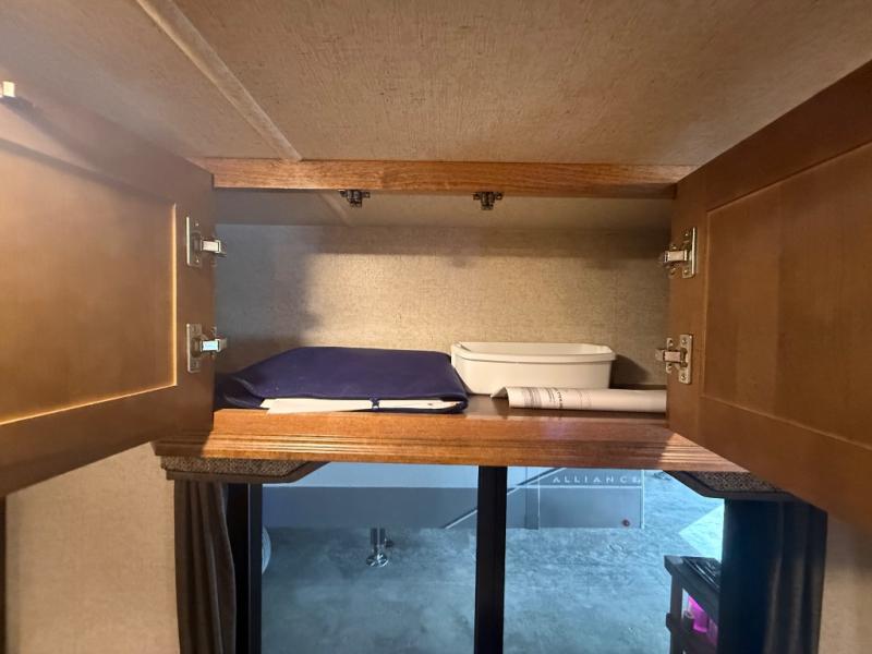 Head up the steps to a side aisle bath. The bath is on your right at the top of the stairs featuring a shower with seat, toilet, vessel sink, medicine cabinet, and linen storage. Along the road side wall there is a slide out beginning in the hallway with a large closet/wardrobe.