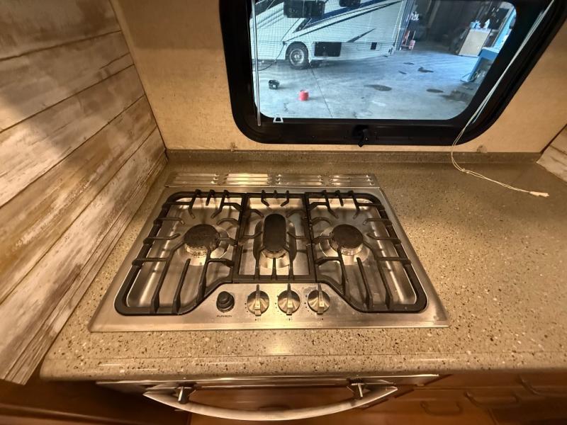 Opposite the door side is the second slide out in the main living/kitchen space. This slide features an entertainment center with flat screen TV and optional fireplace for those cool chilly nights when you want to stay indoors. There is also a pantry, counter space on either side of a three burner range and a double door refrigerator. A much desired kitchen island includes a double sink for easy clean up, additional counter space for prepping or serving meals, and more storage.